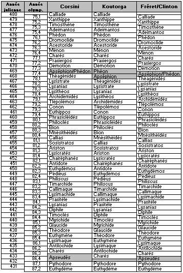 Table 3. Série des archontes éponymes d’Athènes. Enfin, dans le récit qu’il place sous l’archontat d’Appolodore (430/429), Diodore indique que "le général athénien ne cessait point de prendre toutes les forteresses du Péloponnèse et de détruire tout ce qui se présentait à lui dans la campagne"[47]. Il s’agit de la campagne d’une flotte autour du Péloponnèse qui débuta sous l’archontat précédent[48]. Diodore montre ainsi que la belle saison chevauchait ces deux années.