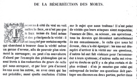 Toujours à côté du vrai on voit naître le faux ; ce n'est pas que le faux naisse du fond même et des principes de la vérité: il est imaginé par certains esprits qui cherchent à trouver dans la vérité même un germe d'erreur, afin de pouvoir plus sûrement la corrompre ; on peut s'en convaincre d'abord par l'exemple des philosophes qui se sont livrés à des recherches du genre de celles qui nous occupent, et par leur peu d'accord les uns avec les autres, ou avec ceux qui les ont précédés ; aussi quelle confusion d'idées sur le sujet que nous traitons ! II n'est point de vérité que leurs attaques aient respectée ; l'essence de Dieu, sa science, ses opérations divines, tous les devoirs qui découlent naturellement de ces connaissances, le culte que nous lui devins, rien n'a été épargné : les uns ont désespéré d'arriver à la vérité sur ces questions, d'autres lui ont fait violence pour l'accommoder à leurs systèmes; d'autres enfin ont révoqué en doute ce qu'il y a de plus certain et de plus évident : d'où je conclus que celui qui entreprend de traiter ces questions doit partager son discours en deux parties ; parler dans l'une pour la vérité, et dans l'autre sur la vérité. La partie destinée à défendre la vérité s'adresse aux personnes qui doutent ou refusent de croire ; celle qui traite du fond de la vérité regarde les esprits droits, amis de la vérité et avides de la connaître. C'est pourquoi, lorsqu'on traite ces sortes de sujets, il faut considérer ce qui convient à l'époque où l'on parle, renfermer la discussion dans les bornes qu'elle exige , établir l'ordre que comporte le sujet, suivre fidèlement le plan qu'on s'est tracé, et mettre chaque chose à la place qui lui convient. La méthode, l'ordre naturel, semblent demander que la partie du discours qui établit la vérité précède la partie destinée à la défendre; mais si l'on considère l'utilité, on verra que c'est au contraire celle-ci qui doit être placée la première. Ainsi voit-on le laboureur attentif à n'ensemencer ses terres qu'après les avoir défrichées et débarrassées des ronces et des épines nuisibles à la semence; ainsi voit-on un habile médecin ne faire prendre à un malade les remèdes propres à lé guérir qu'après l'avoir délivré de toute humeur vicieuse, ou en avoir arrêté le cours ; vous ne ferez jamais entrer la vérité dans un esprit prévenu d'une erreur qui le met en garde contre cette vérité. Aussi, dans l'intérêt de ceux qui m'écoutaient, j'ai toujours commencé par dissiper leur prévention contre la vérité avant de leur donner les preuves qui l'établissent. Procédons de la même manière dans ce discours sur la résurrection; c'est l'ordre qui convient le mieux, je crois, à mes auditeurs. En effet, sur ce point comme sur tant d'autres, plusieurs sont incrédules, d'autres doutent ; ceux mêmes qui admettent les premiers principes ne paraissent pas plus fermes que les autres : mais ce qu'il y à de plus déraisonnable, c'est qu'ici le doute ou l'incrédulité ne reposent sur rien, et ne peuvent pas même s'appuyer sur la plus légère probabilité II. Voici donc comment il faut envisager la question : il est certain que l'incrédulité n'est pas toujours le résultat de la légèreté et dé la précipitation ; qu'elle peut se trouver dans une personne qui cherche sérieusement la vérité et qui désire la connaître ( et l'on peut dire qu'elle est fondée lorsqu'elle se refuse à croire des choses évidemment incroyables ; mais il n'est qu'un esprit faux qui puisse traiter de chimère ce qui n'est pas invraisemblable).. Je demande maintenant à ceux qui doutent de la résurrection, ou qui la nient, si leur doute ou leur incrédulité n'ont pas leur source dans les passions ou les préjugés, et si leur opinion ne se serait point formée sous l'impression des unes ou des autres ? Il faut qu'ils disent que l'homme ne doit son existence qu'au hasard (sur ce terrain il est facile de les battre ), ou bien s'ils reconnaissent une divinité d'où émanent tous les êtres, il leur faut remonter à ce premier principe, et prouver que, même en l'admettant, la résurrection est encore incroyable, impossible; dès lors il leur faudrait démontrer que le pouvoir ou la volonté manquent à ce Dieu pour ranimer nos corps, rassembler leurs membres épars, et recomposer les hommes tels qu'ils étaient autrefois. Mais comment pourraient-ils le prouver? S'ils ne le peuvent, qu'ils renoncent à leur incrédulité, elle serait alors une impiété, et qu'ils cessent de blasphémer ce qu'ils devraient respecter. Montrons qu'ils n'ont aucune raison pour dire que Dieu ne peut pas ressusciter les morts, ou qu'il ne le veut pas. L'impuissance de faire une chose vient de ce qu'on ne sait pas ce qu'on veut faire, où de ce qu'on manque de force pour mettre à exécution ce qu'on a conçu. Je conviens qu'il est impossible d'entreprendre et d'exécuter un ouvrage tant qu'on ignore ce qu'il faut faire ; je sais encore qu'il faut un certain degré de puissance proportionnée à ses lumières pour exécuter l'œuvre qu'on médite, et de la manière qu'on l'a conçue; sans cela, si l'on est sage et qu'on ne veuille rien entreprendre au-delà de ses forces, on se gardera bien de mettre la main à l'œuvre ; ou si l'on est assez téméraire pour tenter quelques efforts, ils serait vains et impuissants. Mais peut-on dire que Dieu ignore la nature des corps qu'il doit rappeler à la vie ; des parties les plus grandes comme des plus petites ; qu'il perd dé vue une seule parcelle de ces corps tombés en dissolution, un seul des éléments auxquels s'est unie chaque parcelle après la dissolution du corps, quelque imperceptibles que soient à nos yeux ces atomes qui ont été se réunir aux parties du monde avec lesquelles ils avaient quelque affinité? N'est-il pas vrai que, même avant l'organisation des êtres divers, Dieu connaissait les principes qui d