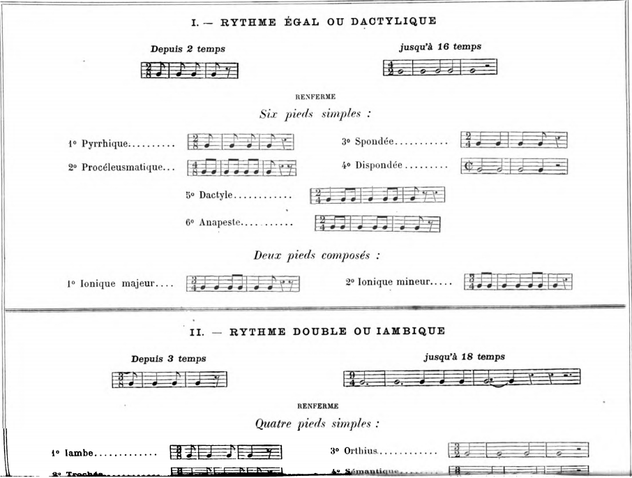 « Il y a trois genres de rythmes : le dactylique ou égal, l’iambique ou double, et le péonique ou sesquialtère, auxquels on adjoint quelquefois l’épitrite ou sesquiterce. Dans le genre dactylique, les signes temporaires, c'est-à-dire les virgules qui servent à marquer les brèves et les longues, sont d'égale valeur à l'arsis et à la thésis, et tous les pieds dans lesquels cette égalité existe sont compris dans le genre dactylique, quel que soit d'ailleurs le nombre des temps dans les deux parties du pied (1 : 1, 2 : 2, 3 : 3, 4 : 4). On compte ainsi seize pieds dactyliques, dont dix sont simples et six par synzygie ou accouplement.