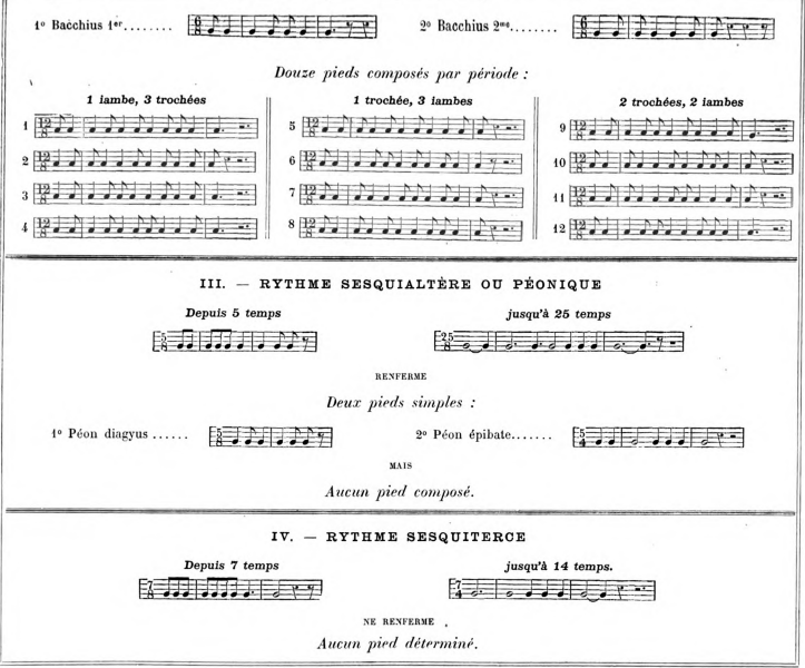 « Passons aux rythmes iambiques. Ce genre renferme quatre sortes de rythmes incomposés, deux composés par synzygie et douze par période. Les rythmes incomposés sont formas : de l’iambe, arsis brève et thésis longue ; du trochée, arsis longue, thésis brève ; de l’orthius, pied de douze temps, dont l'arsis est un spondée et la thésis un dispondée ou leur valeur en temps ; on y retrouve, en effet, la proportion double et la figure de l'iambe (1 : 2 : :4 : 8) ; enfin du chrœsus, pied de douze temps, inverse de l'orthius, c'est-à-dire huit temps à l'arsis et quatre à la thésis ; c'est le trochée quadruplé (2 : 1 : : 8 : 4), appelé aussi trochée sémantique.