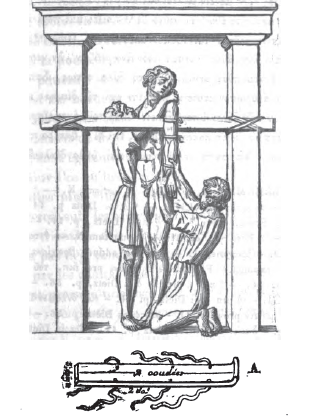 A est la pièce de bois, garnie d'un rebord saillant à une de ses extrémités, et destinée à être mise sous le bras luxé. 93 attachera et le bras et l'avant-bras, et le carpe, afin de les rendre aussi immobiles que possible. L'objet essentiel est de porter l'extrémité du bois aussi en dedans que possible dans l'aisselle, et de lui faire dépasser la tête de l'humérus. Les choses ainsi disposées, on attachera avec solidité une poutrelle transversalement entre deux piliers; on passera le bras lié au bois par-dessus la poutrelle, de façon que le bras soit d'un côté, le corps de l'autre, et la poutrelle en travers de l'aisselle ; alors, on fait subir d'une part au bras lié à la pièce de bob, de l'autre au reste du corps, une traction qui s'exerce autour de la poutrelle : celle-ci sera fixée assez haut pour obliger le patient à se tenir sur la pointe des pieds. Cette réduction est de beaucoup la plus puissante, car elle fait le plus régulièrement l'office de levier, pourvu que le bois soit placé en dedans de la tête de l'humérus ; les efforts en sens contraire sont également les plus réguliers, et ils sont sans danger pour l'os du bras. Aussi les luxations récentes se réduisent-elles plus vite qu'on ne le croirait, avant même de paraître avoir subi les extensions ; de plus, c'est la seule méthode qui triomphe des anciennes luxations, si toutefois le temps n'a pas déjà produit l'envahissement de la cavité articulaire par les chairs, et si la tète de l'humérus ne s'est pas créé par sa pression une loge dans le heu où le déplacement l'a portée; ou plutôt, je pense qu'une luxation du bras, 95 même aussi ancienne, se réduirait par cette méthode (que ne déplacerait pas un levier régulièrement appliqué ?) ; mais je croirais que l'os ne resterait pas en place, et que la luxation se reproduirait comme elle était auparavant. On obtient aussi le même résultat autour d'un échelon, après avoir disposé les choses de la même manière. Il suffit encore, si la luxation est récente, d'exercer l'effort de réduction autour d'une grande chaise de Thessalie e la pièce de bois sera disposée comme il a été dit ; de plus, le patient sera assis de côté sur la chaise ; puis, on portera le bras lié au bois par-dessus le dossier, et on exercera la traction d'une part sur le corps, d'autre part sur le bras lié au bois. On peut, avec le même procédé, pratiquer la réduction par-dessus le panneau inférieur d'une porte à deux panneaux. Il faut toujours savoir se servir de ce qu'on a sous la main. |