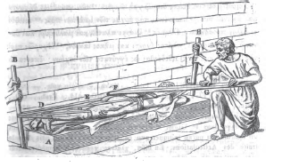 pratiquent l'extension et la contre-extension. 205 terre une pièce de bois forte, large, et ayant une entaille transversale ; on peut encore, au lieu de se servir de la pièce de bois , faire dans la. muraille une entaille transversale, à une coudée du sol ou à la hauteur qui conviendra; puis une espèce de madrier de chêne, quadrangulaire, sera posé le long de la muraille, à une distance qui permette, au besoin, de passer entre deux ; le madrier sera recouvert de tuniques ou de tout autre objet qui, tout en étant souple, ne s'affaissera pas beaucoup. On fera prendre au blessé un bain d'étuve, si cela est possible, ou on le lavera avec beaucoup d'eau chaude, puis ou le couchera sur le ventre tout de son long ; les bras, étendus naturellement, seront attachés au corps ; un lien souple, suffisamment large et long, composé de deux longues lanières, sera placé, par sa partie moyenne» sur le milieu de la poitrine, aussi près que possible des aisselles, et on fera 207 deux tours. Chacune des deux lanières du lien sera, à l'aisselle, passée autour de l'épaule ; puis» les bouts en seront attachés à un bâton en forme de pilon, la longueur des lanières éiant subordonnée à celle du madrier subjacent, contre lequel le bâton en forme de pilon prendra un point fixe pour l'extension. Un autre lien semblable sera passé au-dessus des genoux et un autre au-dessus des talons, les bouts des liens seront attachés à un autre bâton de même forme. Un autre lien large, souple, fort, en forme de ceinture, ayant une largeur et une longueur suffisantes, sera fortement serré autour des lombes aussi près que possible des hanches ; le surplus de ce lien en forme de ceinture, sera attaché, avec les bouts des deux liens précédents, au bâton qui est placé aux pieds. C'est dans cette attitude que l'on pratiquera l'extension et la contre-extension, qui doivent être à la fois égales et en droite ligne : avec une pareille extension convenablement disposée, on ne causera aucun accident grave, à moins qu'on ne le fasse exprès. Le médecin, ou un aide qui sera 209 vigoureux et non sans instruction, placera sur la gibbosité la paume d'une des mains, et, mettant l'autre par dessus, il exercera une pression qu'il aura soin, suivant la disposition des parties, de diriger soit directement en bas, soit vers la tête, soit vers les hanches. Ce mode de pression est le plus inoffensif; inoffensive encore est la pression qu'on exerce en s'asseyant sur la gibbosité en même temps que le blessé est soumis à l'extension, et en se soulevant pour donner de l'impulsion. Rien, non plus, n'empêche d'appuyer avec le pied sur la gibbosité, et de donner une impulsion modérée : quelqu'un de ceux qui ont l'habitude des palestres est passablement propre à exécuter ces manœuvres. Toutefois, la plus puissante des pressions est la suivante : L'entaille faite à la muraille ou à la pièce de bois fichée en terre sera au-dessous du niveau de l'échiné du blessé, autant que cela sera jugé convenable; une planche, assez épaisse, de tilleul ou d'autre bois, sera engagée dans l'entaille ; on mettra sur la gibbosité une étoffe usée pliée en plusieurs doubles, on un petit coussin de cuir: il convient que le corps interposé soit le moins épais possible, car cette interposition n'a d'autre but que d'empêcher la planche de causer par sa dureté une douleur inopportune ; la gibbosité sera exactement vis-à-vis l'entaille pratiquée dans la muraille, afin que la pression de la planche superpose s'exerce principalement sur le lieu de la saillie des vertèbres. La planche étant en place, un aide, ou deux s'il le faut, ils abaissent l'autre bout, pendant que le blessé est soumis, comme il a été dit, à l'extension et à la contre-extension pratiquées suivant la longueur du corps. Il est encore loisible de faire l'extension avec des treuils, que l'on enfoncera en terre à côté du madrier, ou que l'on disposera dans le madrier même, soit que les jambes de ces treuils, 211 perpendiculaires et élevées de peu, soient placées à chaque bout, soit que les axes en soient fixés à chaque extrémité. Ces forces sont faciles à graduer dans l'augmentation comme dans la diminution, et elles sont tellement puissantes que, si on voulait lés employer méchamment et non médicalement, on ferait beaucoup de mal par ce moyen. Et, à vrai dire, d'une part, cette extension et cette contre-extension longitudinales, pratiquées seules et sans l'addition d'aucune pression, n'en exerceraient pas moins une distension qui suffirait; et d'autre part, même sans extension, la pression pratiquée, comme il a été dit, avec la planche seulement, n'en exercerait pas moins une dépression pareillement suffisante. Ce sont des forces précieuses que celles dont on peut graduer soi-même l'intensité ; ajoutez qu'elles agissent conformément à la disposition des parties : d'un côté, la pression force les os saillants à rentrer à leur place ; d'un autre côté, les extensions étant naturelles, rendent à leur position naturelle, en les écartant, les os qui s'étaient rapprochés. Pour moi, je ne sache pas de forces meilleures et plus régulières : l'extension exercée dans la direction de l'épine n'a aucune prise en bas, à l'os appelé sacré ; elle en a bien en haut, au cou et à la tête, mais, opérée en ce point, outre qu'elle est désagréable à voir, elle causerait des accidents si elle était portée trop loin. Il m'est arrivé, le blessé étant étendu sur le dos, de mettre sous la gibbosité une outre non gonflée, et d'insuffler, à l'aide d'un tuyau de forge, l'air dans cette outre sous-jacente ; mais cet essai ne m'a pas réussi: quand l'extension était vigoureuse, l'outre restait affais- 213 sée, et l'air ne pouvait y être introduit ; d'ailleurs, la gibbosité du patient et la rotondité de l'outre, qu'on travaillait à remplir, étant poussées l'une contre l'autre, tendaient à glisser. 