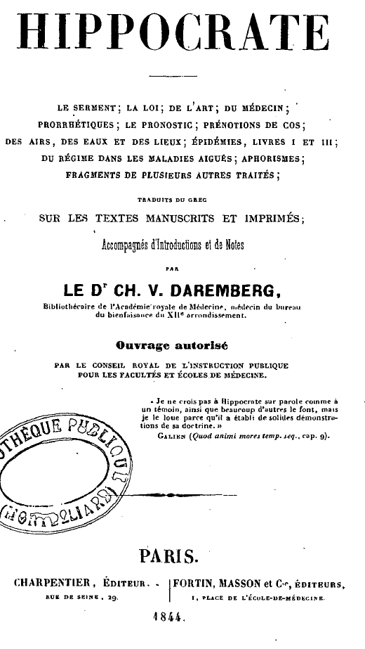 [1] CELUI qui veut s'appliquer convenablement à la médecine doit faire ce qui suit : considérer, premièrement, par rapport aux saisons de l'année les effets que chacune d'elles peut produire, car elles ne se ressemblent pas, mais elles diffèrent les unes des autres, et [chacune en particulier diffère beaucoup d'elle-même] dans ses vicissitudes ; en second lieu, les vents chauds et les vents froids, surtout ceux qui sont communs à tous les pays ; ensuite ceux qui sont propres à chaque contrée. Il doit également considérer les qualités des eaux, car, autant elles diffèrent parleur saveur et par leur poids, autant elles diffèrent par leurs propriétés. Ainsi, lorsqu'un médecin arrive dans une ville dont il n'a pas encore l'expérience, il doit examiner sa position et ses rapports avec les vents et avec le lever du soleil ; car celle qui est exposée au nord, celle qui l'est au midi, celle qui l'est au levant, celle qui l'est au couchant, n'exercent pas la même influence. II considérera très bien toutes ces choses, s'enquerra de la nature des eaux, saura si celles dont on fait usage sont marécageuses et molles, ou dures et sortant de l'intérieur des terres et de rochers, ou si elles sont salines et réfractaires. Il examinera si le sol est nu et sec, ou boisé et humide ; s'il est enfoncé et brûlé par des chaleurs étouffantes, ou s'il est élevé et froid. Enfin il connaîtra le genre de vie auquel les habitants se plaisent davantage, et saura s'ils sont amis du vin, grands mangeurs et paresseux, ou s'ils sont amis de la fatigue et des exercices gymnastiques, mangeant beaucoup et buvant peu. [2] C'est de semblables observations qu'il faut partir pour juger chaque chose. En effet, un médecin qui sera bien éclairé sur ces circonstances, et principalement celui qui le sera sur toutes, ou du moins sur la plupart, en arrivant dans une ville dont il n'a pas encore l'expérience, ne méconnaîtra ni les maladies particulières à la localité (maladies endémiques), ni la nature de celles qui sont communes à tous, ne sera point embarrassé dans leur traitement, et ne tombera point dans les fautes qu'on doit vraisemblablement commettre si l'on n'a pas d'avance approfondi tous ces points. Pour chaque saison qui s'avance et pour l'année, il pourra prédire et les maladies communes à tous (générales) qui doivent affliger la ville en été ou en hiver, et celles dont chacun en particulier est menacé s'il fait des écarts de régime. Connaissant les vicissitudes des saisons, le lever et le coucher des astres, et la manière dont tous ces phénomènes se passent, il pourra prévoir ce que sera l'année. Après de telles investigations et avec la prévision des temps, il sera bien préparé pour chaque cas particulier, connaîtra les moyens les plus propres à rétablir la santé, et n'obtiendra pas un médiocre succès dans l'exercice de son art. Si quelqu'un regardait ces connaissances comme appartenant à la météorologie, pour peu qu'il veuille suspendre son opinion, il se convaincra que l'astronomie n'est pas d'une très mince utilité pour la médecine, mais qu'elle lui est au contraire d'un très grand secours. En effet, chez les hommes, l'état des cavités change avec les saisons. [3] Je vais exposer clairement la manière d'observer et de vérifier chacune des choses dont je viens de parler. Supposons une ville exposée aux vents chauds (ceux qui soufflent entre le lever d'hiver du soleil et le coucher d'hiver), ouverte à ces vents et abritée contre ceux du nord ; les eaux y sont abondantes, mais salines, peu profondes et nécessairement chaudes en été, et froides en hiver. [Ces eaux étant nuisibles à l'homme, elles causent un grand nombre de maladies.] Les habitants ont la tête humide et phlegmatique, et le ventre souvent troublé par le phlegme qui descend de la tête. Chez la plupart, les formes extérieures ont une apparence d'atonie. Ils ne sont capables ni de bien manger ni de bien boire. Tout homme qui a la tête faible ne saurait supporter le vin, car il est plus que d'autres exposé aux accidents que l'ivresse développe du côté de la tête. [Les habitants d'une telle ville ne sauraient vivre longtemps.] Voici maintenant quelles sont les maladies endémiques : les femmes sont valétudinaires et sujettes aux écoulements ; beaucoup sont stériles par mauvaise santé plutôt que par nature ; elles avortent fréquemment. Les enfants sont attaqués de convulsions, d'asthmes auxquels on attribue la production du mal des enfants (de l'épilepsie), qui passe pour une maladie sacrée. Les hommes sont sujets aux dysenteries, aux diarrhées, aux épiales, à de longues fièvres hibernales, aux épinyctides, aux hémorroïdes. Les pleurésies, les péripneumonies, les causas et toutes les maladies réputées aiguës ne sont pas fréquentes, car il n'est pas possible que ces maladies sévissent là où les cavités sont humides. Il y a des ophtalmies humides qui ne sont ni longues ni dangereuses, à moins qu'il ne règne quelque maladie générale, par suite de vicissitudes des saisons. Lorsque les hommes ont passé cinquante ans, ils sont sujets à des catarrhes qui viennent de l'encéphale et qui les rendent paraplectiques, lorsqu'ils ont été subitement frappés sur la tête par un soleil ardent ou par un froid rigoureux. Telles sont les maladies endémiques pour les habitants de ces localités ; et s'il règne en outre quelque maladie générale dépendante des vicissitudes des saisons, ils y participent également. [4] Quant aux villes exposées, au contraire, aux vents froids (ceux qui soufflent entre le coucher d'été du soleil et le lever d'été), qui les reçoivent habituellement et qui sont à l'abri du notus et des [autres] vents chauds, voici ce qui en est : d'abord les eaux y sont généralement dures et froides. Les hommes sont nécessairement nerveux et secs ; la plupart ont les cavités inférieures sèches et réfractaires ; les supé