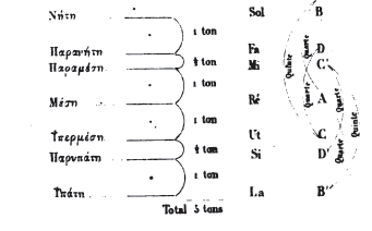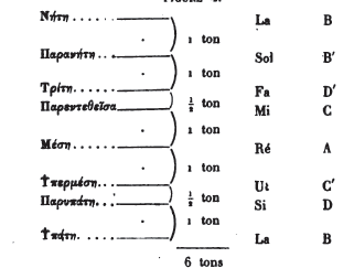 Je dis, de plus, que ce n'était pas seulement dans le tétracorde aigu que l'intercalation pouvait se faire, et qu'elle était également admissible dans le tétracorde grave. Le passage de l'Hagiopolite dont nous nous occupons ici en est la preuve, puisque nous y voyons la mèse à une quinte de distance de l’hypate; et ainsi la description de la figure peut être complétée de la manière suivante, ce qui reproduit absolument les intervalles de la figure 2, mais pris à rebours.
