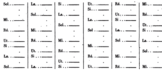 En se bornant à une octave [la-sol-fa-mi-ré-do-si], le premier son [la] présente deux consonances [la-mi, la-ré], et quatre dissonances [la-sol, la-fa, la-do, la-si]. Le deuxième son, sol, présente de même deux consonances, sol-ré, sol-do, et quatre dissonances [sol-la, sol-fa, sol-mi, sol-si]. Il est à remarquer que la première dissonance [sol-la] de ce second cas est la même que la première [fa-sol] du cas précédent. Le troisième son [fa] présente une seule consonance [fa-do] et quatre dissonances [fa-la, fa-sol, fa-ré, fa-si]. Le quatrième son [mi], pouvant monter ou descendre, présente une consonance de chaque côté [mi-la en montant, mi-si en descendant], et, de plus, trois dissonances [mi-sol, mi-ré, mi-do]. Le cinquième son [ré], pris de même pour point de départ en montant ou en descendant, présente deux dissonances de chaque côté [ré-fa et ré-mi d'une part, ré-do et ré-si de l'autre], et en outre deux consonances [ré-la, ré-sol].