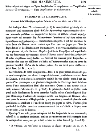 La rédaction de cette compilation, dont, à ce qu'il paraît, il n'existe que ce seul exemplaire, est donc très probablement postérieure à saint Jean de Damas, c'est-à-dire à la première moitié du viiie siècle ; mais il est important de remarquer que plusieurs fragments de l'ouvrage sont évidemment d'une composition bien plus ancienne. Quant à son auteur, ce serait, suivant Fabricius (t. ΙII, p. 654), le patriarche André de Crète; mais quel est le fondement de cette assertion ? nulle raison n'est indiquée à l'appui. Beaucoup d'auteurs de musique sacrée, un Sergius, un Etienne, etc., ont porté le surnom· d'Hagiopolitès[2]; et peut-être y aurait-il plus de vraisemblance à attribuer à l'un d'eux l'écrit qui porte ce titre, d'autant plus qu'André de Crète, mort au commencement du viiie siècle, a dû peu connaître saint Jean de Damas.