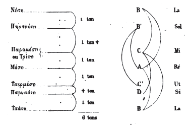 Maintenant, l'adjonction de la huitième corde doit être partagée en deux opérations ou en deux époques : dans la première, la nète et la paranète montent[54] chacune d'un ton, de manière à présenter les intervalles suivants: