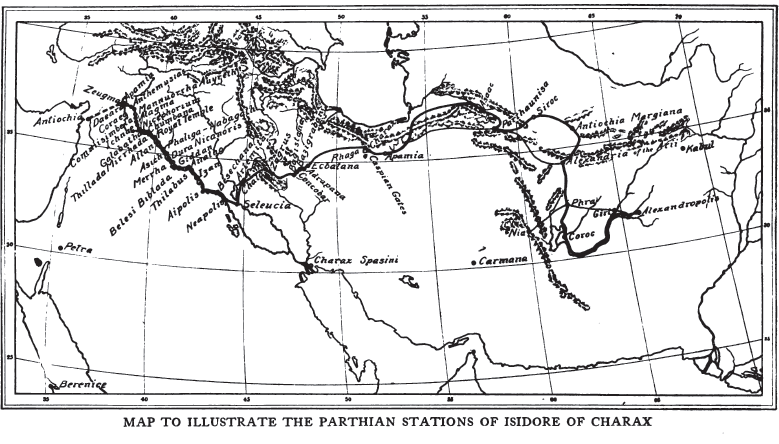 10. Au-delà est l’Hyrcanie,[32] 60 schœnes, dans laquelle il y a 11 bourgs avec des étapes. 10. Ἔντεύθεν Ὑρκανία, σχοῖνοι ξ', ἐν ᾗ κῶμαι ια', ἐν αἷς σταθμοί. 11. Au-delà est l’Astauène,[33] 60 schœnes, dans laquelle il y a 12 villages avec des étapes, et la ville d’Asaak,[34] où Arsace Ier fut proclamé roi, et où une flamme éternelle est conservée. 11 · Ἐντεύθεν Ἀστανην, σχοῖνοι ξ', ἐν ᾗ κῶμαι ιβ' ἐν αἷς σταθμοί· ττόλις δὲ Ἀσαὰκ, ἐν ᾗ Ἀρσάκης πρῶτος βασιλεὺς ἀπεδείχθη. καὶ φυλάττεται ἐνταΰθα πῦρ ἀθάνατον. 12. Au-delà est la Parthyène,[35] 25 schœnes; où est située une vallée, et la ville de Parthaunisa après 6 schœnes ; il y a des tombeaux royaux. Mais les Grecs l’appellent Nisaya. Puis la ville de Gathar après 6 schœnes. Puis la ville de Sirok après 5 schœnes. Il n’y a pas plus d’un village, qui s'appelle Saphri. 12. Ἐντεύθεν Παρθνην, σχοῖνοι κε', ἧς αὐλών. Παρθαύνισα ἡ ττόλις ἀττὸ σχοίνων ϛ'· ἔνθα βασίλικαὶ ταφαί· Ἕλληνες δὲ Νίσαιαν λέγουσιν. Εἶτα Γάθαρ ττόλις ἀπὸ σχοίνὼν ϛ. Εἶτα Σιρὼκ ττόλις ἀπὸ σχοίνων ε'. Κώμας δὲ οὐκ ἔχει πλὴν μιᾶς, ἥτις καλεῖται Σαφρί. 13. Au-delà est l’Apavartikène,[36] 27 schœnes, où se trouve la ville de Apavarctica. Puis la ville de Ragau et deux villages. 13. Ἐντεύθεν Ἀπαυαρκτικηνὴ, σχοῖνοι κζ'· ἐν ᾗ ττόλις Ἀπαυαρκτική. Εἶτα Ῥαγαῦ ττόλις καὶ κῶμαι δύο. 14. Au-delà est la Margiane,[37] 30 schœnes. Là est Antioche, appelée la bien-arrosée,[38] mais il n'y a pas de villages. 14. Ἐντεύθεν Μαργιανὴ, σχοῖνοι λ'. "Ενθα Ἀντιόχεια ἡ καλουμένη Ἔνυδρος· κῶμαι δὲ οὐκ εἰσίν. 15. Au-delà est l’Arie, 30 schœnes. On y trouve la ville de Candace, ainsi que les ville d’Artacoana et d'Alexandrie d’Arie[39] et 4 bourgades. 15. Ἐντεύθεν Ἄρεια, σχοῖνοι λ'. "Ενθα Κίανδὰκ ττόλις καὶ Ἀρτακαύαν ττόλις καὶ Ἀλεξάνδρεια ἡ ἐν Ἀρείοις· κῶμαι δὲ δ'. 16. Au-delà est l’Anauon, qui fait partie de l'Arie, 55 schœnes ; dans laquelle il y a une très grande ville, Phra,[40] et les villes de Bis, Gari et Niè, mais il n'y a pas de village. 16. Ἐντεύθεν Ἀναύων χώρα τῆς Ἀρείας. σχοῖνοι νε', ἐν ᾗ ττόλις μεγίστη Φρὰ καὶ Βὶς ττόλις καὶ Γαρὶ ττόλις και Νιὴ ττόλις· κώμη δὲ οὐκ ἔστιν. 17. Au-delà est la Drangiane,[41] 21 schœnes. Là se trouvent les villes de Parin[42] et de Korok. 17. Ἐντεύθεν Ζαραγγιανὴ, σχοῖνοι κα'. Ἔνθα ττόλις Πάριν καὶ Κορὸκ ττόλις. 18. Au-delà est le Sakastan[43] des Scythes Saces, qui est aussi la Parétacène,[44] 63 schœnes. Il y a les villes de Barda, Min, Palakenti[45] et la ville de Sigal; à cet endroit abrite la résidence royale des Saces, et à proximité se trouve la cité d'Alexandrie[46] et proche se trouve la ville d’Alexandropolis, avec 6 villages. 18. Ἐντεύθεν Σακαστανὴ Σακῶν Σκυθῶν, ἡ καὶ Παραιτακηνὴ, σχοῖνοι ξγ'. Ἔνθα Βαρδὰ ττόλις καὶ Μὶν ττόλις και Παλακεντὶ ττόλις καὶ Σιγὰλ ττόλις· ἔνθα βασίλεια Σάκῶν· καὶ ττλησίον Ἀλεξάνδρεια ττόλις (καὶ ττλησίον Ἀλεξανδρόπολις ττόλις)· κῶμαι δὲ ἕξ. 19. Au-delà est l’Arachosie, 36 schœnes. Et les Parthes appellent cela l’Inde blanche, il y a les cités de Biyt, Pharsana, Khorokhoad[47] et la ville de Démétrias,[48] puis Alexandropolis, la métropole d’Arachosie, elle est grecque, et la rivière Arachotos la traverse. C’est jusqu’à cet endroit, que s’étend la domination des Parthes. 19. Ἐντεύθεν Ἀραχωσία, σχοῖνοι λϛ'. Ταύτην δὲ οἱ Πάρθοι Ἰνδικὴν Λευκὴν καλοῦσιν· ἔνθα Βιὺτ ττόλις καὶ Φάρσανα ττόλις καὶ Χοροχοὰδ πόλις καὶ Δημητριὰς πόλις· εἶτα Ἀλεξανδρόπολις, μητρόπολις Ἀραχωσίας· ἔστι σὲ Ἑλληνὶς, καὶ παραρρεῖ αὐτὴν ττοταμὸς Ἀραχωτός. Ἄχρι τούτου ἐστὶν ἡ τῶν Πάρθων ἐπικράτεια. Ἰσιδώρον Χαρακηνοῦ σταθμοὶ Παρθικοί.
