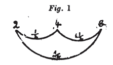 [4] (Fig. 1). Par exemple, soient 2 et 8, dont le moyen sera le nombre 4. Comme 2 est avec 4 dans le rapport de moitié, et 4 avec 8 de même, je multiplie la moitié par la moitié, j'obtiens le quart, et je trouve qu'en effet 2 est le quart de 8.[4]