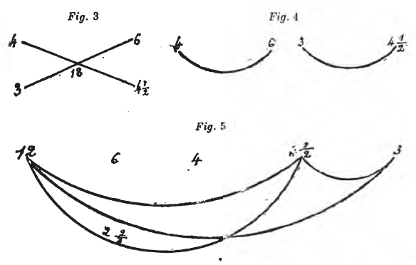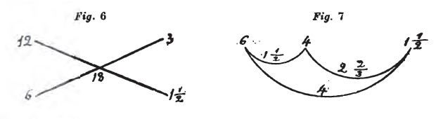 [16] (Fig. 6, 7.) Soit maintenant à ramener l'un des termes du grand rapport au terme correspondant du petit, en se servant, pour ôter le petit rapport, de l'antécédent (du petit rapport). Je dirai : comme 12 est à 3, de même 6 est à un autre nombre. Or, 6 fois 3 font 18; 18 divisé par 12 donne 1 ½. Si je prends[10] ce nombre