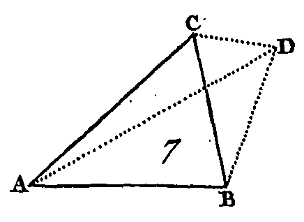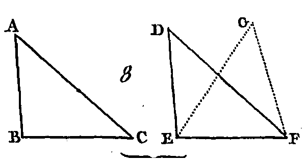 Supposons qu'il soit possible de conduire par les extrémités A, B de la droite AB (fig. 7), deux droites AD, DB égales chacune à chacune à deux autres droites AC, CB conduites aussi par les mêmes extrémités A, B et se rencontrant au point C qui est placé du même côté et qui n'est pas le même que celui où se rencontrent les deux droites AD, DB, de manière que les deux droites CA, DA partant de la même extrémité A soient égales entre elles, et que les deux droites CB, DB partant de la même extrémité B soient aussi égales entre elles ; conduisez la droite CD. Puis donc que la droite AC est égale à la droite AD, l'angle ACD est égal à l'angle ADG (prop. 5) ; d'où il suit que l’angle ADC est plus grand que l'angle DCB, et que l'angle CDB est beaucoup plus grand que DCB; de plus puisque la droite CB est égale à la droite DB, l'angle CDB sera égal à l'angle DCB; mais il a été démontré qu'il est beaucoup plus grand, ce qui est impossible. Donc ayant conduit par les extrémités d'une droite deux droites qui se rencontrent, il est impossible de conduire par les mêmes extrémités deux autres droites qui leur soient égales chacune à chacune, lorsque le point où se rencontrent ces deux dernières droites est placé du même côté et qu’il n'est pas le même que celui où se rencontrent les deux premières ; ce qu'il fallait démontrer. PROPOSITION VIII.THÉORÈME.Si deux côtés d'un triangle sont égaux à deux côtés d'un autre triangle, chacun à chacun, et si la base de l'un est égale à la base de l'autre, l’angle compris entre les côtés égaux est égal dans les deux triangles.