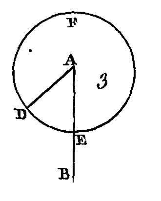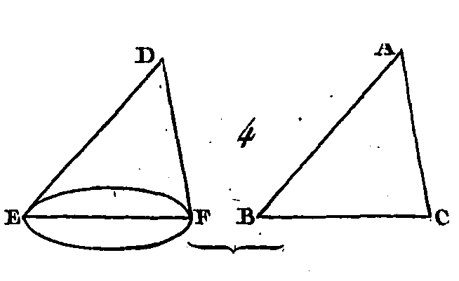 Soient AB et C (fig. 3) les deux droites inégales données dont la plus grande soit AB : il faut de la plus grande AB retrancher une droite qui soit égale à la plus petite C. Du point A conduisez une droite AD égale à la droite C (prop. 2), et du centre A et avec un intervalle AD décrivez la circonférence DEF (dem. 3). Puisque le point A est le centre du cercle DEF, la droite AE sera égale à la droite AD ; mais la droite C est égale à la droite AD : donc les deux droites AE, C sont égales chacune à la droite AD : donc la droite AE est égale à la droite C. Donc les deux droites inégales AB, C ayant été données, il a été retranché de la plus grande AB une droite AE égale à la plus petite C ; ce qu'il fallait faire. PROPOSITION IV.THÉORÈME.Si deux côtés d'un triangle sont égaux à deux côtés d'un autre triangle chacun à chacun, et si l’angle compris entre les côtés égaux est égal dans les deux triangles, la base de l'un sera égale à la base de l'autre; ces deux triangles seront égaux, et les autres angles compris entre les côtés égaux de ces deux triangles seront aussi égaux entre eux.