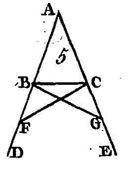 Soit le triangle isocèle ABC (fig. 5) dont le côté AB est égal au côté AC; prolongez les droites AB, AC, vers D et vers E (dem. 2) : je dis que l'angle ABC est égal à l'angle ACB et que l'angle CBD est encore égal à l'angle BCE. Car prenons sur la droite BD un point quelconque F, et de la droite AE retranchons la droite AG égale à la droite AF, qui est plus petite que la droite AE (prop. 3), et conduisons les droites FC et GB. Puisque la droite AF est égale à la droite AG et la droite AB à la droite AC, les deux droites FA, CA seront égales aux deux droites GA, BA chacune à chacune ; mais ces droites comprennent l'angle commun FAG: donc (prop. 4) la base FC sera égale à la base GB ; le triangle AFG sera égal au triangle AGB et les autres angles compris entre les côtés égaux de ces deux triangles seront aussi égaux entre eux, c'est-à-dire, l'angle ACF égal à l'angle ABG, et l'angle AFC à l'angle AGB ; mais comme la droite AF est égale à la droite AG et la droite AB à la droite AC, la droite BF égalera la droite CG (axiome 5), mais il a été démontré que la droite FC est égale à la droite GB : donc les deux droites BF, FC sont égales aux droites CG, GB chacune à chacune; mais l'angle BFC est égal à l'angle CGB et la droite BC est la base commune de ces deux triangles : donc le triangle BFC sera égal au triangle CGB et les autres angles compris entre les côtés égaux de ces deux triangles seront aussi égaux chacun à chacun (prop. 4) donc l'angle FBC est égal à l'angle GCB, et l'angle BCF égal aussi à l'angle CBG. Mais comme il a été démontré que l'angle total ABG était égal à l'angle total ACF et que l'angle CBG était aussi égal à l'angle BCF, l'angle restant ABC (axiome 3) et l'angle restant ACB placés sur la base seront égaux. Il a été démontré aussi que les angles FBC et GCB placés au-dessous de la base étaient aussi égaux. Donc dans les triangles isocèles les angles placés sur la base sont égaux entre eux, et les côtés égaux étant prolongés, les angles placés au-dessous de la base seront aussi égaux entre eux; ce qu'il fallait démontrer. PROPOSITION VI.THÉORÈME.Si deux angles d'un triangle sont égaux entre eux, les côtés opposés à ces angles égaux seront aussi égaux entre eux.