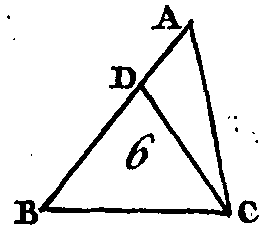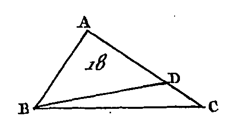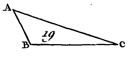 Soit le triangle ABC (fig. 18) ayant le côté AC plus grand que le côté AB : je dis que l'angle ABC est plus grand que l'angle BCA. Puisque le côté AC est plus grand que le côté AB, faites la droite AD égale au côté AB (prop. 3), et conduisez la ligne BD. L'angle ADB, qui est un angle extérieur du triangle BDC, est plus grand que l'angle intérieur et opposé DCB (prop. 16); mais l'angle ADB est égal à l'angle ABD (prop. 5), parce que le côté AB est égal au côté AD : donc l'angle ABD est plus grand que l’angle ACB : donc l'angle ABC est beaucoup plus grand que l'angle ACB. Donc dans un triangle quelconque, un plus grand côté est opposé à un plus grand angle, ce qu'il fallait démontrer. PROPOSITION XIX.THÉORÈME.Dans tout triangle, un plus grand angle est opposé à un plus grand coté.