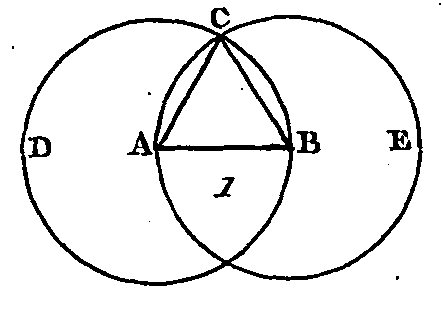 Soit AB (fig. 1) la droite donnée et finie : il faut construire sur la droite AB un triangle équilatéral. Du centre A et avec un intervalle AB, décrivez la circonférence BCD (dem. 3); ensuite du centre B et avec l'intervalle BA décrivez la circonférence ACE, et du point C, où les circonférences se coupent mutuellement, conduisez aux points A, B, les droites CA, CB (dem. 1). Car puisque le point A est le centre du cercle CDB, la droite AC sera égale à la droite AB (déf. 15); de plus, puisque le point B est le centre du cercle CAE, la droite BC sera égale à la droite BA; mais il a été démontré que la droite CA était égale à la droite AB : donc chacune des droites CA, CB est égale à la droite AB ; or les quantités qui sont égales à une même quantité sont égales entre elles ; donc la droite CA est égale à la droite CB : donc les trois droites CA, AB, BC sont égales entre elles. Donc le triangle ABC (déf. 24) est équilatéral, et de plus il est construit sur la ligne donnée et finie AB; ce qu'il fallait faire. PROPOSITION II.PROBLÈME.D'un point donné conduire une droite égale à une droite donnée.
