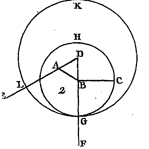Soit A (fig. 2) le point donné et BC la droite donnée : il faut conduire du point A une droite égale à la droite BC. Conduisez du point A au point B la droite AB (dem. 1) ; sur cette droite construisez le triangle équilatéral DAB (prop. 1), et prolongez les droites AE, BF dans la direction des côtés DA, DB ; du centre B et avec l'intervalle BC, décrivez la circonférence CGH (dem. 5); et du centre D et avec l'intervalle DG décrivez ensuite la circonférence GKL. En effet, puisque le point B est le centre du cercle CGH, la droite BG sera égale à la droite BG (déf. 15) ; de plus, puisque le point D est le centre du cercle GKL, la droite DL sera égale à la droite DG ; mais la droite DA est égale à la droite DB : donc la droite AL sera égale à la droite BG (axiome 3) ; mais il a été démontré que la droite BC est égale à la droite BG : donc les droites AL, BC sont égales chacune à la droite BG. Mais les quantités qui sont égales à une même quantité sont égales entre elles : donc la droite AL est égale à la droite BC. Donc du point donné B on a conduit une droite AL égale à la ligne donnée BC; ce qu'il fallait faire. PROPOSITION III.PROBLÈME.Deux droites inégales étant données, retrancher de la plus grande une droite égale à la plus petite.