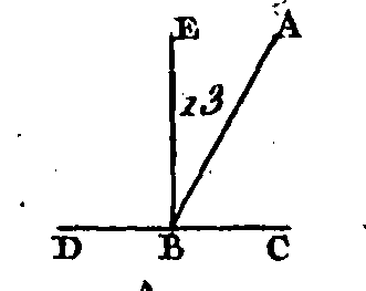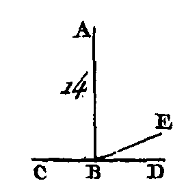 Qu'une droite quelconque AB (fig. 13) placée sur une droite DC fasse les angles CBA, ABD : je dis que les angles CBA, ABD ou seront droits ou égaux à deux droits. Car si l'angle CBA est égal à l'angle ABD, ces deux angles seront droits (déf. 10). Si le contraire arrive, du point B conduisez la droite BE de manière qu'elle fasse deux angles droits avec la droite DC (prop. 11). Puisque l'angle CBE est égal aux deux angles CBA, ABE, si on ajoute un angle commun EBD, les angles CBE, EBD seront égaux aux trois angles CBA, ABE, EBD. De plus, comme l'angle DBA est égal aux deux angles DBE, EBA, si on ajoute un angle commun ABC, les angles DBA, ABC seront égaux aux trois angles DBE, EBA, ABC ; or il a été démontré que les angles CBE, EBD sont aussi égaux à ces trois angles : donc puisque les choses qui sont égales à une même chose sont égales entre elles, les angles CBE, EBD seront égaux aux angles DBA, ABC; mais les angles CBE, EBD sont deux angles droits ; donc les angles DBA, ABC sont égaux à deux angles droits. Donc si une droite placée sur une autre droite forme des angles, elle fera ou deux angles droits ou deux angles égaux à deux droits; ce qu'il fallait démontrer. PROPOSITION XIV.THÉORÈME.Si dans un point quelconque d'une ligne droite, deux droites placées de différents côtés font avec elle deux angles de suite égaux à deux droits, ces deux droites seront dans la même direction, c'est-à-dire qu'elles ne formeront qu'une seule et même droite.