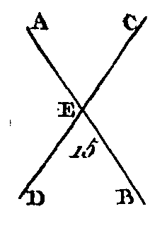 Que dans un point B (fig. 14) de la ligne droite ÀB les deux droites BC, BD placées de différents côtés fassent avec elle les angles de suite ABC, ABD égaux à deux droits : je dis que la droite BD est dans la direction de la droite CB. Car si la droite BD n'est point dans la direction de la droite BC, supposons que la droite BE soit dans la direction de la droite BC (dem. 2). Puis donc que la droite AB est placée sur la droite CBE, les angles ABC, ABE seront égaux à deux droits (prop. 13) ; mais les angles ABC, ABD sont égaux à deux droits par supposition : donc les angles CBA, ABE sont égaux, aux angles CBA, ABD. Otez l'angle commun ABC, l'angle restant ABE sera égal à l'angle restant ABD, c'est-à-dire que le plus petit sera égal au plus, grand ; ce qui est impossible. La droite BE n'est donc pas dans la direction de la droite BC. Nous démontrerons de la même manière qu'il n'y en a point d'autre qui soit dans la direction de BC, si ce n'est BD. Donc la droite CB est dans la direction BD. Donc si dans un point quelconque d'une ligne droite, deux droites placées de différents côtés font avec elle deux angles de suite égaux à deux droits, ces deux droits seront dans la même direction ; ce qu'il fallait démontrer. PROPOSITION XV.THÉORÈME.Si deux droites se coupent mutuellement, elles font les angles au sommet égaux entre eux.