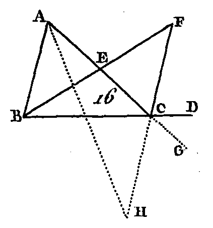 Soit le triangle ABC (fig. 16), prolongez le côté BC jusqu'en D : je dis que l'angle extérieur ACD est plus grand que chacun des angles intérieurs et opposés CBA, BAC. Partagez la droite AC en deux parties égales en E (prop. 10) ; et après avoir conduit la droite BE, prolongez-la vers le point F, faites la droite EF égale à la droite BE (prop. 3), conduisez la droite FG et prolongez AC jusqu'en G. Puisque la droite AE est égale à la droite EC et la droite BE égale aussi à la droite EF, les deux droites AE, EB seront égales aux deux droites CE, EF ; chacune à chacune ; l'angle AEB est égal à l'angle FEC (prop. 15), puisqu'ils sont opposés au sommet ; donc la base AB est égale à la base FC (prop. 4) ; le triangle ABE est égal au triangle FEC, et les angles opposés à des côtés égaux sont égaux chacun à chacun : donc l'angle BAE est égal à l'angle ECF (ax. 9) ; mais l'angle ECD est plus grand que l'angle ECF : donc l'angle ACD est plus grand que l’angle BAE. Si on partage le côté BC en deux parties égales, on démontrera de la même manière que l'angle BCG, c'est-si-dire l'angle ACD (prop. 15), est plus grand que l'angle ABC. Donc, ayant prolongé un côté d'un triangle quelconque, l'angle extérieur est plus grand que chacun des angles intérieurs et opposés ; ce qu'il fallait démontrer. PROPOSITION XVII.THÉORÈME.Deux angles d'un triangle quelconque, de quelque manière qu'ils soient pris, sont moindres que deux droits.