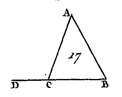 Soit le triangle ABC (fig. 17) : je dis que deux angles du triangle ABC, de quelque manière qu'ils soient pris, sont moindres que deux droits. Prolongez la droite BC jusqu'en D (dem. 2). L'angle extérieur ACD du triangle ABC est plus grand que l'angle intérieur et opposé ABC (prop. 16). Donc si nous ajoutons un angle commun ACB, les angles ACD, ACB seront plus grands que les angles ABC, BCA; mais les angles ACD, ACB sont égaux à deux droits. (prop. 13) : donc les angles ABC, BCA sont moindres que deux droits. On démontrera de la même manière que les angles BAC, ACB sont aussi moindres que deux droits; on démontrera encore la même chose par rapport aux angles CAB, ABC. Donc deux angles d'un triangle quelconque, de quelque manière qu'ils soient pris, sont moindres que deux angles droits, ce qu'il fallait démontrer. PROPOSITION XVIII.THÉORÈME.Dans tout triangle, un plus grand côté est opposé à un plus grand angle.