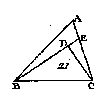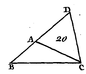 Car soit le triangle ABC (fig. 20) : je dis que deux côtés du triangle ABC, de quelque manière qu'ils soient pris, sont plus grands que le côté restant ; c'est-à-dire que les côtés BA, AC sont plus grands que le côté BC ; les côtés AB, BC plus grands que le côté AC, et les côtés BC, CA plus grands que le côté AB. Prolongez le côté AB vers le point D, faites la droite DA égale à la droite CA (prop. 3), et conduisez la droite DC. Puisque la droite DA est égale à la droite AC, l'angle ADC sera égal à l'angle ACD (prop. 5) ; mais l'angle BCD est plus grand que l'angle ACD (ax. 9) ; donc l'angle BCD est plus grand que l’angle ADC : donc, puisque dans le triangle DCB, l'angle BCD est plus grand que l'angle BDC, et qu'un plus grand côté est opposé à un plus grand angle (prop. 19), le côté DB sera plus grand que le côté BC ; mais la droite DB est égale aux côtés AB, AC; donc les côtés AB, AC sont plus grands que le côté BC. Nous démontrerons de la même manière que les côtés AB, BC sont plus grands que le côté CA, et les côtés BC, CA plus grands que le côté AB. Donc deux côtés d'un triangle quelconque, de quelque manière qu'ils soient pris, sont plus grands que le côté restant ; ce qu'il fallait démontrer. PROPOSITION XXI.THÉORÈME.Si des extrémités d'un côté d'un triangle on mène deux droites qui se rencontrent dans ce triangle, ces deux droites seront plus courtes que les deux autres cotés du triangle, mais elles comprendront un angle plus grand.