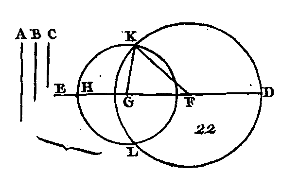 Soient données les trois droites A, B, C (fig. 22), dont deux, de quelque manière qu'on les prenne, soient plus grandes que la troisième ; c'est-à-dire les droites A, B plus grandes que la droite C, les droites A et C plus grandes que B, et enfin les droites B et C plus grandes que A : il faut avec trois droites égales aux droites A, B, C construire un triangle. Supposons la droite DE terminée en D et indéfinie vers E ; faites la droite DF égale à la droite A (prop. 3), la droite FG égale à la droite B et la droite GH égale à la droite C ; ensuite du centre F et avec l'intervalle FD, décrivez la circonférence DKL (dem. 5), du centre G avec l'intervalle GH décrivez la circonférence KLH, et conduisez les droites KF, KG : je dis que le triangle KFG est construit avec trois droites égales aux droites A, B, C. Car puisque le point F est le centre du cercle DKL, la droite FK est égale à la droite FD (déf. 15) ; mais la droite FD est égale à la droite A : donc la droite KF égale la droite A. De plus, puisque le point G est le centre du cercle LKH, la droite GH est égale à la droite GR; mais la droite GH est égale à la droite C : donc la droite KG égale la droite C ; or la droite KG est égale à la droite B : donc les trois droites KF, FG, GK égalent les trois droites A, B, C. Donc le triangle KFG a été construit avec trois droites KF, FG, GK qui sont égales aux trois droites données A, B, C ; ce qu'il fallait faire. PROPOSITION XXIII.PROBLÈME.Sur une droite donnée et à un point donné dans cette droite, construire un angle égal à un angle donné.