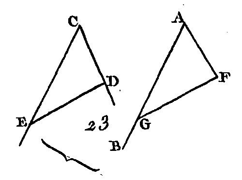 Soit AB (fig. 23) la droite donnée et A le point donné dans cette droite; que DCE soit l'angle donné : il faut sur la droite donnée AB et au point donné A construire un angle rectiligne égal à l'angle rectiligne donné DCE. Soient pris dans Tune et l'autre ligne CD, CE deux points quelconque D, E ; conduisez la droite DE, et avec trois droites égales aux droites CD, DE, CE, construisez le triangle AFG (prop. 22), de manière que la droite CD soit égale à la droite AF, la droite CE égale à la droite AG, et la droite DE égale à la droite FG. Puisque les deux droites DC, CE sont égales aux deux droites FA, AG, chacune à chacune, et que la base DE est égale à la base FG, l'angle DCE sera égal à l'angle FAG (prop. 8). Donc l'angle rectiligne FAG a été construit égal à l'angle rectiligne DCE sur la droite donnée AB, et au point donné A dans cette droite. PROPOSITION XXIV.THÉOREME.Si deux triangles ont deux côtés égaux à deux côtés, chacun à chacun, et si l'un des angles compris entre ces côtés égaux est plus grand que l'autre, la base de l'un de ces triangles sera aussi plus grande que la base de l'autre.