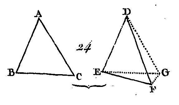 Soient les deux triangles ABC, DEF (fig. 24) dont les deux côtés AB, AC sont égaux aux deux côtés. DE, DF, chacun à chacun, c'est-à-dire le côté AB égal au côté DE et le côté AG au côté DF ; que l'angle BAC soit plus grand que l'angle EDF : je dis que la basé BC est plus grande que la base EF. Car puisque l'angle BAC est plus grand que l'angle EDF, construisez sur la droite DE et au point D un angle EDG égal à l'angle BAC (prop. 25) ; faites la droite DG égale à l'une ou à l'autre des droites AC, DF (prop. 3), et conduisez les droites GE, FG. Puisque la droite AB est égale à la droite DE, et la droite AC égale à la droite DG, les deux droites BA, AC seront égales aux deux droites ED, DG, chacune à chacune ; mais l'angle BAC est égal par construction à l'angle EDG: donc la base BC sera égale à la base EG (prop. 4). De plus, puisque la droite DG est égale à la droite DF, et l'angle DFG sera égal à l'angle DGF (prop. 5), donc l'angle DFG sera plus grand que l'angle EGF : donc l'angle EFG sera beaucoup plus grand que l'angle EGF ; mais puisque l'angle EFG du triangle EFG est plus grand que l'angle EGF, et qu'un angle plus grand est opposé à un côté plus grand (prop. 19), le côté EG est plus grand que le côté EF; mais le côté EG est égal au côté BC par construction : donc le côté BC est plus grand que le côté EF. Donc si deux triangles ont deux côtés égaux à deux côtés, chacun à chacun, et si l'un des angles compris entre ces côtés égaux est plus grand que l'autre, la base de l'un de ces triangles sera plus grande que la base de l'autre. PROPOSITION XXV.THÉORÈME.Si deux triangles ont deux côtés égaux chacun à chacun, et si la base de l'un est plus grande que la base de l'autre, ils auront aussi les angles compris entre les côtés égaux plus grands l'un que l'autre.