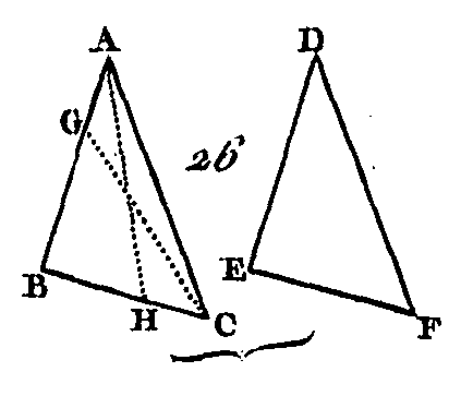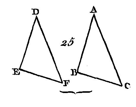 Soient ABC, DEF (fig. 25) deux triangles qui aient les deux côtés AB, AC égaux aux deux côtés DE, DF, chacun à chacun, c'est-à-dire le côté AB égal au côté DE, et le côté AC égal au côté DF; que la base BC soit plus grande que la base EF : je dis que l'angle BAC est plus grand que EDF. Car si l'angle BAC n'est pas plus grand que l'angle EDF, il lui est égal, ou il est plus petit ; or l'angle BAC n'est pas égal à l'angle EDF, car alors la base B C serait égale à la base EF (prop. 4) ; niais elle ne lui est pas égale ; donc l'angle BAC n'est pas égal à l'angle EDF. L'angle BAC n'est pas plus petit que l'angle EDF, car s'il était plus petit, la base BC serait plus petite que la base EF (prop. 24) ; or elle n’est pas plus petite : donc l'angle BAC n'est pas plus petit que l'angle EDF. Mais il a été démontré qu'il ne lui est pas égal : donc l'angle BAC est plus grand que l'angle EDF. Donc si deux triangles ont deux côtés égaux, chacun à chacun, et si la base de l'un est plus grande que la base de l'autre, ils auront aussi les angles compris entre les côtés égaux plus grands l'un que l'autre ; ce qu'il fallait démontrer. PROPOSITION XXVI.THÉORÈME.Si deux triangles ont deux angles égaux, chacun à chacun, s'ils ont de plus un coté égal à un côté, ou celui qui est adjacent aux angles égaux ou celui qui est opposé à un des angles égaux, ils auront les autres côtés égaux, chacun à chacun, et le troisième angle de l'un sera encore égal au troisième angle de l’autre.