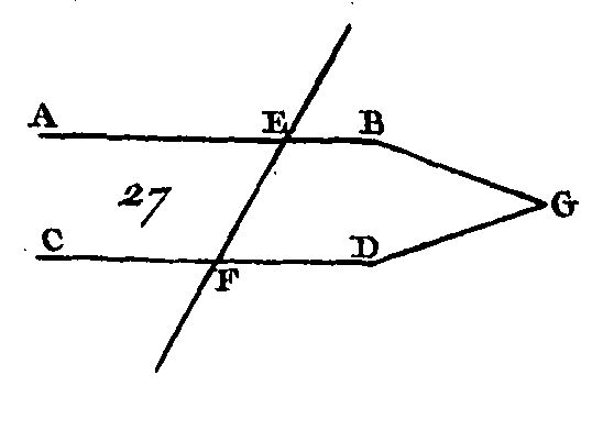 Soient ABC, DEF (fig. 26) deux triangles qui aient les deux angles ABC, BCA égaux aux deux angles DEF, EFD, chacun à chacun, c'est-à-dire l'angle ABC égal à l'angle DEF et l'angle BCA égal à l'angle EFD ; que ces deux triangles aient aussi un côté égal à un côté, et d'abord celui qui est adjacent aux angles égaux, c'est-à-dire le côté BC égal au côté EF : je dis qu'ils auront les autres côtés égaux aux autres côtés, chacun à chacun, c'est-à-dire le côté AB égal au côté DE, et le côté AC égal au côté DF; je dis de plus que l'angle BAC sera encore égal à l'angle EDF. Car si le côté AB n'est pas égal au côté DE, l'un de ces côtés sera plus grand que l'autre. Soit AB le plus grand côté ; faites la droite GB égale au côté DE (prop. 3), et conduisez la droite GC. Puisque le côté BG est égal au côté DE, et le côté BC égal au côté EF, les deux côtés BG, BC sont égaux aux deux côtés DE, EF, chacun à chacun ; mais l'angle GBC est égal à l'angle DEF : donc la base GC est égale à la base DF (prop. 4); le triangle GCB est égal au triangle DEF, et les autres angles qui sont opposés à des côtés égaux sont aussi égaux entre eux : donc l'angle GCB est égal à l'angle DFE ; mais l'angle DFE est supposé égal à l'angle BCA : donc l'angle BCG est égal à l'angle BCA, c'est-à-dire que le plus petit est égal au plus grand, ce qui est impossible : donc les côtés AB et DE ne sont pas inégaux : donc ils sont égaux ; ruais le côté BG est égal au côté EF : donc les deux côtés AB, BC sont égaux aux deux côtés DE, EF, chacun à chacun; mais l'angle ABC est égal à l'angle DEF : donc la base AC est égale à la base DF (prop. 4), et le troisième angle BAC est égal au troisième angle EDF. Supposons à présent que les côtés qui sont opposés aux angles égaux soient égaux, c'est-à-dire le côté AB égal au côté DE : je dis que les autres côtés de l'un de ces triangles sont encore égaux aux autres côtés de l'autre triangle; c'est-à-dire que le côté AC sera égal au côté DF, le côté BC égal au côté EF, et le troisième BAC égal aussi au troisième angle EDF. Car si le côté BC n'est pas égal au côté EF, l'un de ces côtés sera plus grand que l'autre. Supposons s'il est possible que BC soit le plus grand ; faites BH égal au côté EF (prop. 3), et conduisez la droite AH. Puisque le côté BH est égal au côté EF et le côté AB égal au côté DE, les deux côtés AB, BH seront égaux aux deux côtés DE, EF, chacun à chacun ; mais ces côtés comprennent des angles égaux : donc la base AH est égale à la base DF (prop. 4) 5 le triangle ABH est égal au triangle DEF, et les autres angles qui sont opposés à des côtés égaux seront aussi égaux, chacun à chacun : donc l'angle BHA est égal à l'angle EFD; mais par supposition l'angle EFD est égal à l'angle BGA : donc l'angle BHA est égal à l'angle BCA, c'est-à-dire que l'angle extérieur BHA du triangle ACH est égal à l'angle BCA intérieur et opposé ; ce qui est impossible (prop. 16) : donc les côtés BG et EF ne sont pas inégaux : donc ils sont égaux. Mais le côté AB est égal au côté DE : donc les deux côtés AB, BC sont égaux aux deux côtés DE, EF, chacun à chacun ; mais ces côtés comprennent des angles égaux : donc la base AC est égale à la base DF (prop. 4) ; le triangle ABC est égal au triangle DEF, et le troisième angle BAC égal aussi à un troisième angle EDF. Donc si deux triangles ont deux angles égaux, chacun à chacun, et un côté quelconque égal à un côté, ou celui qui est adjacent aux angles égaux, ou celui qui est opposé à un des angles égaux, les autres côtés sont égaux aux autres côtés, chacun à chacun, et ces deux triangles auront un troisième angle égal à un troisième angle ; ce qu'il fallait démontrer. PROPOSITION XXVII.THÉORÈME.Si une droite tombant sur deux autres droites fait les angles alternes égaux entre eux, ces deux droites seront parallèles.
