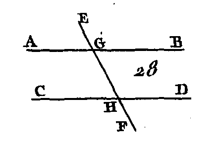 Que la droite EF (fig. 28) tombant sur les deux droites AB, CD fasse l'angle extérieur EGB égal à l'angle intérieur opposé et placé du même côté GHD, ou bien les angles intérieurs et placés du même côté BGH, GHD égaux à deux droits : je dis que la droite AB est parallèle à la droite CD. Car puisque l'angle EGB est égal à l'angle GHD, et que l'angle EGB est égal à l'angle AGH (prop. 15), l'angle AGH sera égal à l'angle GHD; mais ces angles sont alternes: donc la droite AB est parallèle à la droite CD (prop. 27). De plus, puisque les angles BGH, GHD sont égaux à deux droits, et que les angles AGH, BGH sont encore égaux à deux droits (prop. 13), les angles AGH, BGH seront égaux aux angles BGH, GHD. Donc si nous retranchons l'angle commun BGH, l'angle restant AGH sera égal à l'angle restant GHD; mais ces deux angles sont alternes : donc la droite AB est parallèle à la droite CD (prop. 27). Donc si une droite tombant sur deux autres droites fait un angle extérieur égal à un angle intérieur opposé et placé du même côté, ou si elle fait les angles intérieurs et placés du même côté égaux à deux droits, ces droites seront parallèles ; ce qu'il fallait démontrer. PROPOSITION XXIX.THÉORÈME.Si une droite tombe sur deux parallèles, les angles alternes sont égaux entre eux, l'angle extérieur est égal à l'angle intérieur opposé et placé du même côté, et les angles intérieurs placés du même côté sont égaux à deux droits.
