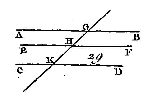 Si la droite EF (fig. 28) tombe sur les parallèles AB, CD, je dis que les angles alternes AGH, GHD seront égaux entre eux, l'angle extérieur EGB sera égal à l'angle intérieur opposé et placé du même côté GHD, et les angles intérieurs et placés du même côté BGH, GHD seront égaux à deux droits. Car si l'angle AGH n'est pas égal à l'angle GHD, l'un de ces angles sera plus grand. Que l'angle AGH soit le plus grand; puisque l'angle AGH est plus grand que l'angle GHD, si on leur ajoute un angle commun BGH, les angles AGH, BGH seront plus grands que les angles BGH, GHD ; mais les angles AGH, BGH sont égaux à deux droits (prop. 13) : donc les angles BGH, GHD sont moindres que deux droits ; mais deux droites étant prolongées à l'infini du côté où les angles intérieurs sont plus petits que deux droits se rencontrent entre elles (ax. 11) : donc les droites AB, CD prolongées à l'infini se rencontreront ; mais elles ne se rencontreront pas puisqu'elles sont parallèles : donc les angles AGH, GHD né sont point inégaux, donc ils sont égaux. Mais l'angle AGH est égal à l'angle EGB (prop. 15) : donc l'angle EGB sera égal à l'angle GHD. Donc si nous ajoutons un angle commun BGH, les angles EGB, BGH seront égaux aux angles BGH, GHD ; mais les angles EGB, BGH sont égaux à deux droits (prop. 13) : donc les angles BGH, GHD sont égaux à deux droits. Donc si une droite tombe sur deux parallèles, les angles alternes sont égaux entre eux, l'angle, extérieur est égal à l'angle intérieur opposé et placé du même côté, et les angles intérieurs placés du même côté sont égaux à deux droits ; ce qu'il fallait démontrer. PROPOSITION XXX.THÉORÈME.Les droites qui sont parallèles à une même droite sont parallèles entre elles.