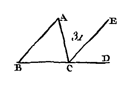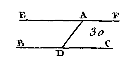Soit A (fig. 30) le point donné et BC la droite donnée : il faut par le point A conduire une droite parallèle à la droite BC. Prenez sur la droite BC un point quelconque t), et menez AD ; construisez sur la droite DA et en tin point A un angle DAE égal à l'angle ADC, et prolongez la droite AF dans la direction de EA. Puisque la droite AD tombant sur les deux droites BC, EF fait les angles alternés EAD, ADC égaux entre eux, la droite BC sera parallèle à la droite EF (prop. 27). Donc par le point donné A, la droite EAF a été menée parallèle à la droite donnée BC, ce qu'il fallait faire. PROPOSITION XXXII.THÉORÈME,Ayant prolongé un côté d'un triangle quelconque, l'angle extérieur est égal aux deux angles intérieurs et opposés, et les trois angles intérieurs du triangle sont égaux à deux droits.