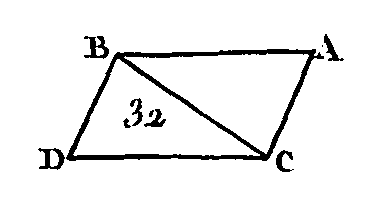 Soit ACDB (fig. 32) un parallélogramme et BC sa diagonale : je dis que les côtés et les angles opposés du parallélogramme ACDB sont égaux, et que sa diagonale BC le partage en deux parties égales. Car puisque la droite AB est parallèle à la droite CD et que la droite BC tombe sur ces deux droites, les angles alternes ABC, BCD seront égaux entre eux (prop. 29). De plus, puisque la droite AC est parallèle à la droite BD et que la droite BC tombe sur ces deux droites, les angles alternes ACB, CBD sont égaux entre eux ; donc les deux triangles ABC, CBD ont deux angles ABC, BCA égaux aux deux angles BCD, CBD, chacun à chacun, ils ont de plus un côté commun BC adjacent à des angles égaux: donc ils auront les autres côtés égaux aux autres côtés, chacun à chacun (prop. 26), et le troisième angle égal au troisième angle : donc le côté AB est égal au côté CD, et l'angle BAC égal à l'angle BDC. Puisque l’angle ABC est égal à l'angle BCD, et l'angle CBD égal à l'angle ACB, l'angle total ABD sera égal à l'angle total ACD: Mais il a été démontré que l'angle BAC est égal à l’angle BDC. Donc les côtés et les angles opposés des parallélogrammes sont égaux entre eux. Je dis de plus que la diagonale partage les parallélogrammes en deux parties égales. Car puisque la droite AB est égale à la droite CD et que la droite BC est commune aux deux triangles, les deux droites AB, BC seront égales aux droites DC, CB, chacune à chacune ; mais l'angle ABC est égal à l'angle BCD : donc la base AC est égale à la base BC (prop. 4), et le triangle ABC égal au triangle BCD. Donc la diagonale BC partage le parallélogramme ACDB en deux parties égales ; ce qu'il fallait démontrer. PROPOSITION XXXV.THÉORÈME.Les parallélogrammes qui sont construits sur la même base et entre les mêmes parallèles sont égaux entre eux.