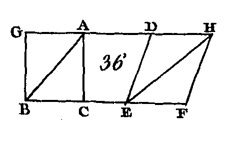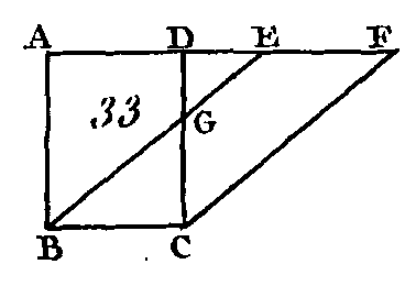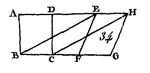 Soient les parallélogrammes ABCD, EBCF (fig. 33) construits sur la même base BC et entre les mêmes parallèles AF, BC : je dis que le parallélogramme ABCD est égal au parallélogramme EBCF. Car puisque ABCD est un parallélogramme, la droite AD est égale à la droite B C (prop. 34), et par la même raison la droite EF est aussi égale à la droite B C : donc la droite AD est égale à la droite EF : donc, si on ajoute une droite commune DE, la droite totale AE sera égaler la droite totale DF (axiome 2) ; mais la droite AB est égale à la droite DC : donc les deux droites EA, AB sont égales aux deux droites FD, DC, chacune à chacune ; mais l'angle extérieur F'DC est égal à l'angle intérieur EAB (prop. 29) : donc la base EB est égale à la base FC (prop. 4), et le triangle EAB égal au triangle FDC ; donc si l’on retranche la partie commune DGE, le trapèze restant ABGD sera égal au trapèze restant EGCF. Donc si on leur ajoute le triangle commun GBC, le parallélogramme total ABCD sera égal au parallélogramme total EBCF. Donc les parallélogrammes construits sur les mêmes bases et entre les mêmes parallèles sont égaux entre eux ; ce qu'il fallait démontrer. PROPOSITION XXXVI.THÉORÈME.Les parallélogrammes construits sur des bases égales et entre les mêmes parallèles sont égaux entre eux.