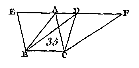 Soient les triangles ABC, DEC (fig. 35) construits sur la même base BC et entre les mêmes parallèles AD, BC, je dis que le triangle ABC est égal au triangle DBC, Prolongez de part et d'autre la droite AD vers les points E, F, et par le point B conduisez une droite BE parallèle à la droite CA (prop. 31), et par le point C conduisez aussi une droite CF parallèle à BD. Les figures EBCA, DBCF sont des parallélogrammes, et le parallélogramme EBCA est égal au parallélogramme DBCF (prop. 35) ; car ils sont construits l'un et l'autre sur la même base et entre les mêmes parallèles ; mais le triangle ABC est la moitié du parallélogramme EBCA; car la diagonale AB le partage en deux parties égales; le triangle DBC est la moitié du parallélogramme DBCF, car la diagonale DC la partage en deux parties égales (prop. 34) ; mais, les moitiés des quantités égales sont égales; entre elles ; donc le triangle ABC est égal au triangle DBC. Donc les triangles construits sur la même base et entre les mêmes parallèles sont égaux entre eux; ce qu'il fallait démontrer. PROPOSITION XXXVIII.THÉORÈME.Les triangles construits sur des bases égales et entre les mêmes parallèles sont égaux entre eux.