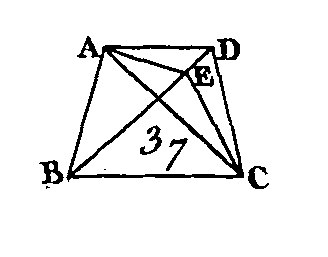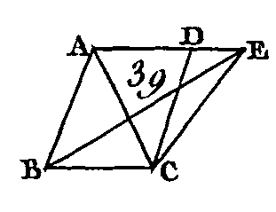 Soient les deux triangles égaux ABC, DBC (fig. 37) construits sur la même base BC et placés du même côté : je dis que ces deux triangles sont compris entre les mêmes parallèles. Conduisez la droite AD : je dis que la droite AD est parallèle à la droite BC. Car si la droite AD n'est pas parallèle à la droite BC, conduisez par le point A une droite AE parallèle à la droite BC (prop. 31); conduisez ensuite la droite EC. Le triangle ABC est égal au triangle EBC (prop. 37), car ces deux triangles sont construits sur la même base BC, et compris entre les mêmes parallèles BC, AE. Mais par hypothèse le triangle ABC est égal au triangle DBC: donc le triangle EBC est égal au triangle DBC, c'est à-dire que le plus grand est égal au plus petit, ce qui ne peut se faire : donc la droite AE n'est point parallèle à la droite BC. Nous démontrerons de même que toute autre droite, excepté AD, ne peut être parallèle à BG : donc la droite AD est parallèle à la droite BC. Donc les triangles égaux qui sont construits sur la même base et qui sont placés du même côté sont compris entre les mêmes parallèles ; ce qu'il fallait démontrer. PROPOSITION XL.THÉORÈME.Les triangles égaux qui sont construits sur des bases égales et qui sont placés du même côté sont compris entre les mêmes parallèles.
