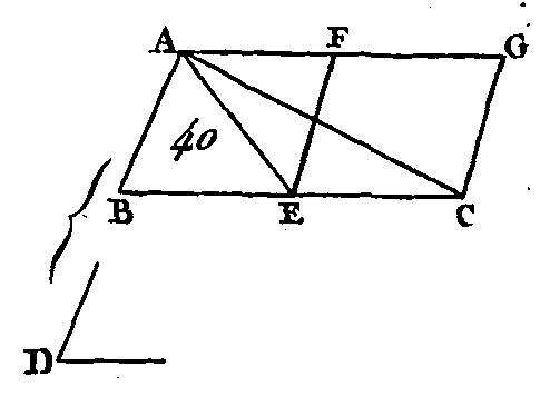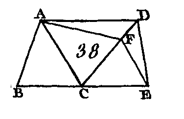 Soient les triangles égaux ABC, CDE (fig. 38) construits sur des bases égales. BC, CE et placés du même côté : je dis qu'ils sont compris; entre les mêmes parallèles. Conduisez la droite AD: je dis que la droite AD est parallèle à la droite BE. Car si la droite AD n'est pas parallèle à la droite BE, conduisez par le point A la droite AF parallèle à la droite BC, et conduisez ensuite la droite FE. Le triangle ABC est égal au triangle FCE (prop. 38) ; car ces deux triangles sont construits sur des bases égales et compris entre les mêmes parallèles BE, AF ; mais le triangle ABC est égal au triangle DCE : donc le triangle DCE est égal au triangle FCE, c'est-à-dire que le plus grand est égal au plus petit, ce qui ne peut être : donc la droite AF n'est point parallèle à la droite BE. Nous démontrerons de la même manière que toute autre droite, excepté AD, ne peut être parallèle à BF : donc la droite AD est parallèle à la droite BE. Donc les triangles égaux qui sont construits sur des bases égales et qui sont placés du même côté sont compris entre les mêmes parallèles ; ce qu'il fallait démontrer. PROPOSITION XLI.THÉORÈME.Si un parallélogramme et un triangle ont la même: base et sont compris entre les mêmes parallèles, le parallélogramme est double du triangle.