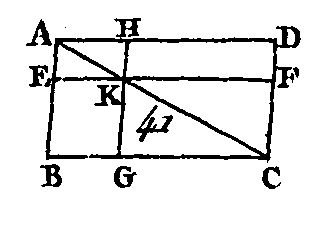 Soit ABC (fig. 40) le triangle donné et D l'angle donné : il faut construire un parallélogramme qui soit égal au triangle ABC dans un angle égal à l'angle donné D. Partagez la droite BC en deux parties égales au point E et conduisez la droite AE ; sur la droite EC et au point E construisez un angle CEF égal à l'angle D (prop. 23), par le point A conduisez une droite AG parallèle à la droite EC (prop. 31), et par le point C conduisez aussi une droite CG parallèle à la droite FE : la figure FECG sera un parallélogramme. Puisque la droite BE est égale à la droite EC, le triangle ABE sera égal au triangle AEG (prop. 38), car ces deux triangles sont construits sur des bases égales BE, EC, et compris entre les mêmes parallèles BC, AG : donc le triangle ABC est double du triangle AEC ; mais le parallélogramme FECG est double du triangle AEC, car ils ont la même base et ils sont compris entre les mêmes parallèles : donc le parallélogramme FECG est égal au triangle ABC (ax. 6), et il a un angle égal à l'angle D. Donc le parallélogramme FECG a été construit égal au triangle ABC dans un angle CEF égal à l'angle donné D ; ce qu'il fallait faire. PROPOSITION XLIII.THÉORÈME.Dans tout parallélogramme, les compléments des parallélogrammes qui sont autour de la diagonale sont égaux entre eux.