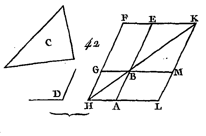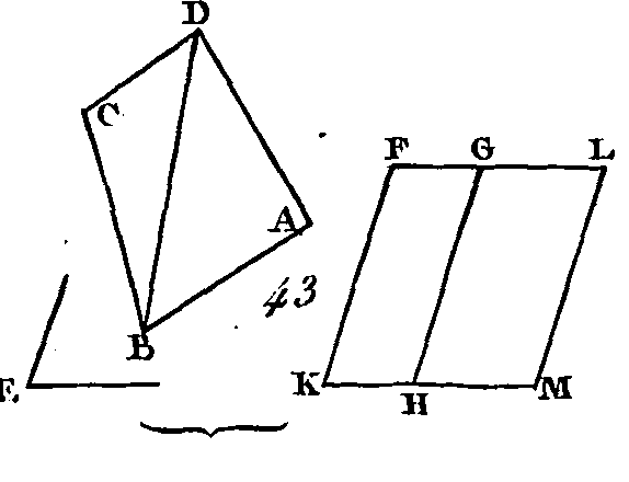 Soient donnés la droite AB (fig. 42), le triangle C et l'angle D : il faut sur la droite AB et dans un angle égal à l'angle D, construire un parallélogramme égal au triangle donné C. Construisez un parallélogramme BEFG égal au triangle C ; dans un angle EBG égal à l'angle D (prop. 42); placez la droite BE dans la direction de la droite AB; prolongez la droite FG vers H ; et par le point A conduisez la droite AH parallèle à la droite BG ou à la droite EF (prop. 31), et menez la droite GB. Puisque la droite HF tombe sur les parallèles AH, EF, les angles AHF, HFE sont égaux à deux angles droits (prop. 29) : donc les angles BHG, GFE sont moindres que deux angles droits; mais les droites qui sont prolongées à l'infini du coté où les angles intérieurs sont moindres que deux angles droits se rencontrent (ax. 11) : donc les droites HB, FE se rencontreront étant prolongées ; que ces deux droites soient pro longées (dem. 2), et supposons qu'elles se rencontrent en K; par le point K conduisez la droite KL parallèle à la droite EA ou à la droite FH (prop. 31), et prolongez les droites AH, GB vers les points L, M. La figure HLKF est un parallélogramme dont HK est la diagonale ; autour de la diagonale, HK sont les parallélogrammes AG, ME, et les parallélogrammes LB, BF, qu'on nomme compléments: donc le parallélogramme LB est égal au parallélogramme BF (prop. 43); mais le parallélogramme BF est égal au triangle C ; donc le parallélogramme LB sera égal au triangle C ; et puisque l'angle GBE est égal à l'angle ABM (prop. 15) et que l'angle GBE est égal à l'angle D, l’angle ABM sera égal à l'angle D. Donc sur la droite donnée AB et dans un angle ABM égal à l'angle D, le parallélogramme LB a été construit égal au triangle donné C ; ce qu'il fallait faire. PROPOSITION XLV.PROBLÈME.Construire, dans un angle donné, un parallélogramme qui soit égal à une figure rectiligne donnée.