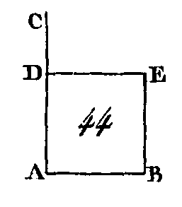 Soit AB (fig. 44) la droite donnée : il faut décrire un carré sur cette droite. Du point A, donné dans la droite AB, conduisez une droite AC perpendiculaire sur la droite AB (prop. 11) ; faites la droite AD égale à la droite AB (prop. 31); par le point D conduisez la droite DE parallèle à la droite AB (prop. 31), et par le point B conduisez aussi une droite BE parallèle à la droite AD. La figure ADEB est un, parallélogramme : donc la droite AB est égale à la droite DE, et la droite AD égale à la droite BE; mais la droite AB est égale à la droite AD : donc les quatre droites BA, AD, DE, EB sont égales entre elles : donc le parallélogramme ADEB, est équilatéral. Je dis de plus, qu'il est rectangle, car puisque la droite AD tombe sur les parallèles AB, DE, les angles BAD, ADE sont égaux à deux droits (prop. 29) ; mais l'angle BAD est droit par construction; donc l'angle ADE est droit aussi. Mais les côtés et angles opposés des parallélogrammes sont égaux (prop. 34) ; donc chacun des angles opposés ABE, BED est droit, et par conséquent le parallélogramme ADEB est rectangle ; mais nous avons démontré qu'il était équilatéral. Donc le parallélogramme ADEB est un carré décrit sur la droite AB ; ce qu'il fallait faire. PROPOSITION XLVII.THÉORÈME.Dans les triangles rectangles, le carré décrit sur le côté opposé à l'angle droit est égal aux carrés construits sur les côtés oui comprennent l'angle droit.