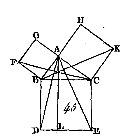 Soit ABC (fig. 45) un triangle rectangle dont l'angle droit est BAC : je dis que le carré construit sur le coté BC est égal aux carrés construits sur les côtés BA, AC. Construisez le carré BDEC sur le côté BC; construisez aussi les deux carrés GB, HC sur les côtés BA, AC, et par le point A conduisez une droite AL parallèle à l'une ou à l'autre des droites BD, CE, conduisez ensuite les droites Puisque chacun des angles BAC, BAG est droit et que les deux droites AC, AG, placées de part et d'autre de la droite BA, font au point A, avec la droite AB, deux angles de suite égaux à deux angles droits, la droite CA est dans la direction de la droite AG : la droite AB est dans la direction de la droite AH, par la même raison; et puisque l'angle DBC est égal à l'angle FBA (axiome 10), étant droits l'un et l'autre, si nous leur ajoutons un angle commun ABC, l'angle total DBA sera égal à l'angle total FBC ; mais les deux droites DB, BA étant égales aux deux droites CB, BF, chacune à chacune, et l'angle DBA égal à l'angle FBC, la base AD sera égale à la base FC, et le triangle ABD égal au triangle FBC (prop. 4). Or le parallélogramme BL est double du triangle ABD (prop. 41) car ils ont la même base BD et sont compris entre les mêmes parallèles BD, AL. Le carré GB est aussi double du triangle FBC, car ils ont la même base FB et sont compris entre les mêmes parallèles FB, GC, mais les quantités qui sont doubles de quantités égales sont égales entre elles : donc le parallélogramme BL est égal au carré GB. Ayant conduit les droites AE, BK, nous démontrerons de la même manière que le parallélogramme CL est égal au carré HC : donc le carré total BDEC est égal aux deux carrés GB, HC ; mais le carré BDEC est construit sur le côté BC, et les carrés GB, HC sont construits sur les côtés BA, AC : donc le carré BE, construit sur le côté BC, est égal aux carrés construits sur les côtés BA, AC. Donc dans les triangles rectangles, le carré construit sur le côté opposé à l'angle droit est égal aux deux carrés construits sur les côtés qui comprennent l'angle droit ; ce qu'il fallait démontrer. PROPOSITION XLVIII.THÉORÈME.Si le carré qui est construit sur un des côtés d'un triangle est égal aux carrés construits sur les autres côtés du triangle, l'angle compris entre ces deux derniers côtés est droit.