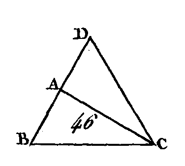Que le carré construit sur un côté BC (fig. 46) d'un triangle ABC, soit égal aux carrés construits sur les deux autres côtés BA, AC : je dis que l'angle BAC est droit. Conduisez du point A une droite AD perpendiculaire sur la droite AC (prop. 11) ; faites la droite AD égale à la droite BA, et conduisez la droite DC. Car puisque la droite DA est égale à la droite AB, le carré construit sur DA sera égal au carré construit sur AB. Donc si nous ajoutons un carré commun, celui qui est construit sur AC, les carrés construits sur DA, AC seront égaux aux carrés construits sur BA, AC. Mais le carré construit sur DC est égal aux carrés construits sur DA, AC (prop. 47) car l'angle DAC est droit. Or le carré construit sur BG est supposé égal aux carrés construits sur BA, AC : donc le carré construit sur DC est égal à celui qui est construit sur BC : donc le côté DC est égal au côté CB ; et comme le côté AD est égal au côté AB et que le côté AC est commun, les deux côtés AD, AC sont égaux aux deux côtés BA, BC, chacun à chacun; mais la base DC est égale à la base CB ; donc l'angle DAC est égal à l'angle BAC (prop. 8) ; mais l'angle DAC est droit : donc l'angle BAC est droit aussi. Donc si le carré construit sur un côté d'un triangle est égal aux carrés construits sur les deux autres côtés, l'angle compris par ces deux derniers côtés sera droit ; ce qu'il fallait démontrer.
