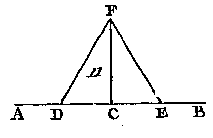 Soit AB (fig. 11) la droite donnée et C le point donné dans cette droite : il faut par le, point C conduire sur la droite AB une droite qui fasse deux angles droits. Prenez dans la ligne AC un point quelconque D, faites CE égale à CD (prop. 3), construisez sur la droite DE un triangle équilatéral FDE (prop. 1), et menez la droite FG : je dis que la droite CF, conduite par le point C, sur la droite donnée AB, fait deux angles droits avec elle. Car puisque la droite CD est égale à la droite CE et que la droite FC est commune, les deux droites DC, CF sont égales aux deux droites EC, CF, chacune à chacune; mais la base DF est égale à la base EF : donc l'angle DCF est égal à l'angle ECF (prop. 8). Or ces deux angles sont de suite ; mais quand une droite fait avec une autre les angles de suite égaux entre eux, chacun des angles égaux est droit (déf. 10) : donc chacun des angles DCF, FCE est droit. Donc la droite FC, conduite par le point G sur la droite AB, fait deux angles droits avec la droite AB ; ce qu'il fallait faire. PROPOSITION XII.PROBLÈME.Sur une droite donnée et indéfinie et d'un point placé hors d'elle, mener une perpendiculaire.