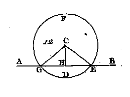 Soit AB (fig. 12) la droite donnée et indéfinie, et C le point donné placé hors de cette droite : il faut sur cette droite donnée et indéfinie AB, conduire du point donné C, pris hors de cette droite, une droite perpendiculaire. Prenez de l'autre côté de la droite AB un point quelconque D, et du centre C et avec un intervalle CD décrivez une circonférence EFG (dem. 3), partagez la droite EG en deux parties égales au point H (prop. 10), et conduisez les droites CG, CH, CE : je dis que sur la droite indéfinie AB et du point donné C placé hors de cette droite on a mené une perpendiculaire CH. Car puisque la droite GH est égale à la droite HE, et que la droite CH est commune, les deux droites GH, HC sont égales aux deux droites EH, HC, chacune à chacune ; mais la base CG est aussi égale à la base CE (déf. 15) : donc l'angle GHG est égal à l'angle EHC (prop. 8). Or ces deux angles sont de suite ; mais lorsqu'une droite tombant sur une droite fait avec elle les angles de suite égaux entre eux, chacun de ces angles est droit, et la droite tombante est dite perpendiculaire à celle sur laquelle elle tombe. Donc on a conduit une perpendiculaire CH sur la droite indéfinie AB, du point donné C, qui est placé hors de cette droite ; ce qu'il fallait faire. PROPOSITION XIII.THÉORÈME.Si une droite placée sur une autre droite fait des angles, elle fera avec elle ou deux angles droits ou deux angles égaux à deux angles droits.