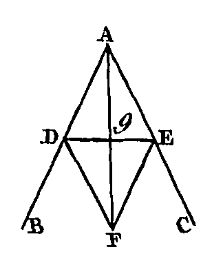 Des extrémités B, C (fig. 21) du côté BC, menez en dedans du triangle ABC les deux droites BD, DC : je dis que les droites BD, DC seront plus petites que les deux autres côtés BA, AC du triangle ABC, et qu’elles comprendront un angle BDC plus grand que l'angle BAC. Prolongez la droite BD jusqu'au point E. Puisque deux côtés d'un triangle quelconque sont plus grands que le côté restant (prop. 20), les deux côtés AB, AE du triangle ABE sont plus grands que le côté BE. Donc si nous ajoutons une droite commune EC, les côtés BA, AG seront plus grands que les droites BE, EG. De plus, puisque les deux côtés CE, ED du triangle CED sont plus grands que le côté CD, si nous ajoutons une droite commune DB, les droites CE, EB seront plus grandes que les droites CD, DB ; mais on a démontré que les côtés BA, AC sont plus grands que les droites BE, EC : donc les côtés BA, AC sont beaucoup plus grands que les côtés BD, DC. Mais comme un angle extérieur d'un triangle quelconque est plus grand qu'un des angles intérieurs et opposés (prop. 16), l'angle BDC, qui est un angle extérieur du triangle CDE, est plus grand que l'angle CED. Par la même raison l'angle CEB, qui est un angle extérieur du triangle ABE, est plus grand que l'angle BAC ; mais il a été démontré que l'angle BDG est plus grand que l'angle CEB : donc l'angle BDC est beaucoup plus grand que l'angle BAC. Donc si des extrémités d'un côté d'un triangle quelconque on mène deux droites qui se rencontrent dans ce triangle, ces deux droites seront plus petites que les deux autres côtés du triangle, et elles comprendront un plus grand angle ; ce qu'il fallait démontrer. PROPOSITION XXII.PROBLÈME.Avec trois droites égales à trois droites données construire un triangle ; il faut que deux de ces trois droites, de quelque manière qu'elles soient prises, soient plus grandes que la troisième.