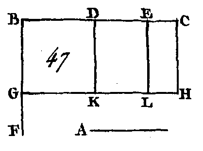 Soient deux droites A, BC (fig. 47), et que la droite BC soit partagée d'une manière quelconque aux points D, E : je dis que le rectangle compris sous les droites A, BC est égal au rectangle compris sous les droites A, BD, au rectangle compris sous les droites A, DE, et au rectangle compris sous les droites A, EC. Conduisez par le point B la droite BF perpendiculaire sur la droite BC (prop. 11. I)[1]; faites la droite BG égale à la droite A, et par le point G conduisez la droite GH parallèle à la droite BC (prop. 31. I); par les points D, E, C, conduisez ensuite les droites DK, EL, CH, parallèles à la droite BG. Le rectangle BH est égal aux rectangles BK, DL, EH; mais le rectangle BH est compris sous les droites A, BC, car il est compris sous les droites GB, BC, dont la droite BG est égale à la droite A ; le rectangle BK est compris sous les droites A, BD, car il est compris sous les droites GB, BD, dont la droite GB est égale à la droite A; le rectangle DL est compris sous les droites A, DE, puisque DK, c'est-à-dire BG, est égale à la droite A; et enfin, le rectangle EH est compris sous les droites A, EC : donc le rectangle compris sous les droites A, BC est égal, au rectangle compris sous les droites A, BD, au rectangle compris sous les droites A, DE ; et enfin au rectangle compris sous les droites A, EC. Donc si l'on a deux droites, et si l'une d'elles est partagée en un certain nombre de parties, le rectangle compris sous ces deux droites est égal aux rectangles compris sous la droite qui n'a point été partagée et sous chacun des segments de l'autre ; ce qu'il fallait démontrer. PROPOSITION II.THÉORÈME.Si une droite est partagée d'une manière quelconque en deux parties, le rectangle compris sous la droite totale et sous l’un et l'autre segment, est égal au carré de la droite entière.