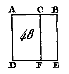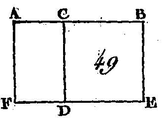 Que la droite AB (fig. 48) soit partagée d'une manière quelconque au point C : je dis que le rectangle-compris sous les droites AB, BÇ, avec le rectangle compris sous les droites BA, AC, est égal au carré de la droite AB. Sur la droite. AB construisez le carré ADEB (prop. 46. I), et par le point C conduisez la droite CF parallèle à l'une et à l'autre des droites AD, BE (prop. 31. I). Le carré AE est égal aux rectangles: AF, CE ; mais le carré AE est construit sur la droite AB ; le rectangle AF est compris sous les droites BA, AC, car il est compris sous les droites DA, AC, dont la droite AD est égale à AB; et enfin le rectangle CE est compris sous les droites AB, BC, puisque la droite BE est égale à la droite AB ; donc le rectangle compris sous les droites BA, AC, avec le rectangle compris sous les droites AB, BC, est égal au carré de la droite AB. Donc si une droite est partagée d'une manière quelconque en deux parties, les rectangles compris sous la droite totale et sous chacun des segments sont égaux au quatre construit sur la droite totale ; ce qu'il fallait démontrer. PROPOSITION III.THÉORÈME.Si une droite est partagée d'une manière quelconque en deux parties, le rectangle compris sous la droite totale et l'un des segments, est égal au rectangle compris sous les segments et au carré formé sur le segment premièrement pris.