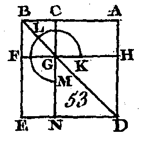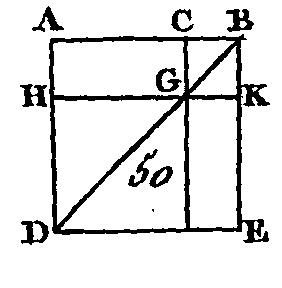 Que la droite AB (fig. 50) soit partagée d'une manière quelconque au point C : je dis que le carré construit sur AB est égal aux carrés construits sur AC, CB, et au double du rectangle compris sous les segments AC, CB. Construisez le carré ADEB sur la droite AB (prop. 46. I), conduisez la droite BD; par le point C conduisez la droite CGF parallèle à l'une ou à l'autre des droites AD, BE (prop. 31. I), et par le point G conduisez la droite HK parallèle à l'une ou à l'autre des droites AB, DE. Puisque la droite CF est parallèle à la droite AD, et que la droite BD tombe sur ces deux droites, l'angle extérieur BGC sera égal à l'angle intérieur et opposé ADB (prop. 29. I) ; mais l'angle ADB est égal à l'angle ABD (prop. 5. I), parce que le côté BA est égal au côté AD ; donc l'angle CGB est égal à l'angle GBC : donc le côté BC est égal au côté CG (prop. 6. I) ; mais le côté CB est égal au côté GK (prop. 34. I), et le côté CG égal au côté BK : donc le côté GK est égal au côté GG : donc le quadrilatère CGKB est équilatère. Je dis dé plus qu'il est rectangle; car puisque la droite CF est parallèle à la droite BK, et que la droite CB tombe sur ces deux droites, les angles KBC, GCB sont égaux à deux droites (prop. 29. I); mais l'angle KBC est droit (déf. 50. I) : donc l'angle GCB est droit aussi : donc les angles opposés CGK, GKB seront encore droits (prop. 34. I) : donc le quadrilatère CGKB est rectangle. Mais on a démontré qu'il était équilatère; donc ce quadrilatère est un carré, et ce carré est construit sur la droite BC. Par la même raison le quadrilatère HF est encore un carré qui est construit sur HG, c'est-à-dire sur AC. Donc HF, CK sont deux carrés construits sur AC, CB; et puisque le rectangle AG est égal au rectangle GE (prop. 43. I), et que ce rectangle AG est compris sous les droites AC, CB, la droite GC étant égale à CB, le rectangle GE sera égal à un rectangle qui est compris sous les droites AC, GB : donc les rectangles AG, GE sont égaux au double du rectangle qui est compris sous les droites CB ; mais les carrés HF, CK sont construits sur les droites AC, CB: donc les quatre figures HF, CK, AG, GE sont égales aux carrés construits sur AC, CB et au double du rectangle compris sous les droites AC, CB; mais les quatre figures HF, CK, AG, GE composent toute la figure ADEB qui est le carré construit sur AB ; donc le carré construit sur AB est égal aux carrés construits sur AC, CB, et au double du rectangle compris sous les droites AC, CB. Donc si une droite est partagée d'une manière quelconque, le carré de la droite entière est égal au carré des segments et au double du rectangle compris sous ces segments; ce qu'il fallait démontrer. AUTREMENT.Je dis que le carré construit sur la droite AB est égal aux carrés construits sur AC, CB et au double du rectangle compris sous AC, CB. En effet, puisque dans la même figure le côté BA est égal au côté AD, l'angle ABD sera égal à l'angle ADB (prop. 5. I); et comme les trois angles d'un triangle quelconque sont égaux à deux droites (prop. 32. I), les trois angles ABD, ADB, BAD du triangle ABD seront égaux à deux droits. Mais l'angle BAD est droit : donc les deux autres angles ABD, ADB sont égaux à un angle droit ; or ces deux angles sont égaux entre eux : donc chacun des angles ABD, ADB est égal à la moitié d'un angle droit. Mais l'angle BCG est droit, car il est égal à l'angle intérieur et opposé BAD : donc l'angle restant CGB est la moitié d'un angle droit; donc l'angle CGB est égal à l'angle CBG : donc le côté BC est égal au côté CG (prop. 34. I) ; mais CB est égal à KG, et CG égal aussi à BK (prop. 34. I) : donc le quadrilatère CK est équilatère ; mais il a un angle droit : donc ce quadrilatère est un carré, et ce carré est construit sur le segment CB. Le quadrilatère HF est un carré, par la même raison, et ce carré est construit sur le segment AC : donc les quadrilatères CK, HF sont deux carrés, et ces deux carrés sont construits sur les segments AC, CB. De plus, puisque le rectangle AG est égal au rectangle EG (prop. 31. I), et que le rectangle AG est compris sous les droites AC, CB, car la droite CG est égale à la droite CB, le rectangle EG est égal au rectangle compris sous les droites AC, CB : donc les rectangles AG, GE sont égaux au double du rectangle qui serait compris sous les droites AC, CB, mais les carrés CK, HF sont égaux à ceux qui seraient construits sur les segments AC, CB : donc les quatre figures CK, HF, AG, GE sont égales aux carrés construits sur les segments AC, CB, et au double du rectangle compris sous ces mêmes segments. Mais les figures CK, HF, AG, GE composent toute la figure AE qui est le carré construit sur AB. Donc le carré formé sur la droite AB est égal aux carrés formés sur les droites AC, CB, et au double du rectangle compris sous les mêmes droites AC, CB; ce qu'il fallait démontrer, COROLLAIRE.Il suit de là que, dans les carrés, les parallélogrammes qui sont autour de la diagonale sont toujours des carrés. PROPOSITION V.Si une droite est coupée en deux parties égales et en deux parties inégales, le rectangle compris sous les deux segments inégaux de la droite entière avec le quatre de la droite qui est placée entre les points de section, est égal au carré de la moitié de cette droite.