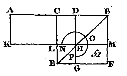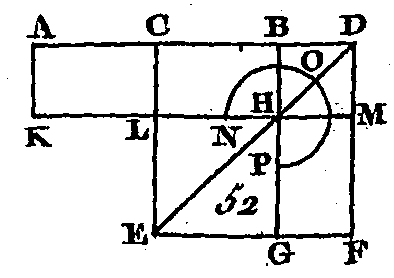 Qu'une droite quelconque AB (fig. 51) soit coupée en deux parties égales au point C et en deux parties inégales au point D : je dis que le rectangle compris sous les droites AD, DB, avec le carré construit sur CD, est égal au carré construit sur CB. Sur la droite BC construisez le carré CEFB (prop. 46. I), et conduisez la droite BE ; par le point D conduisez la droite DHG parallèle à l'une ou à l'autre des droites CE, BF (prop. 31. I) ; par le point H conduisez la droite KLM parallèle à l'une ou à l'autre des droites CB, EF, et enfin par le point A conduisez la droite AK parallèle à l'une ou l'autre des droites CL, BM. Puisque le complément CH est égal au complément HF (prop. 43. ï), si nous ajoutons à chacun de ces compléments le quatre DM, le rectangle total CM sera égal au rectangle total DF ; mais le rectangle CM est égal au rectangle AL (prop. 56. I), puisque la droite AC est égale à la droite CB : donc le rectangle AL est égal au rectangle DF; donc si nous ajoutons le rectangle CH à chacun de ces deux rectangles, le rectangle total AH sera égal aux rectangles DF, DL; mais le rectangle AH est compris sous les droites AD, DB, puisque la droite DH est égale à la droite DB; or les rectangles FD, DL forment le gnomon NOP : donc le gnomon NOP est égal au rectangle compris sous les droites AD, DB ; donc si nous ajoutons à chacune de ces deux quantités le carré LG qui est égal au carré de CD (corol. 4. II), le gnomon NOP et le carré LG seront égaux au rectangle compris sous les droites AD, DB, et au carré construit sur CD; mais le gnomon NOP et le carré LG forment tout le carré CEFB qui est construit sur CB : donc le rectangle compris sous AD, DB, avec le carré construit sur CD, est égal au carré construit sur CB. Donc si une droite est coupée en deux parties égales et en deux parties inégales, le rectangle compris sous les deux segments inégaux de la droite totale avec le carré de la droite qui est placée entre les deux points de section, est égal au carré de la moitié de cette droite ; ce qu'il fallait démontrer. PROPOSITION VI.THÉORÈME.Si une ligne droite est coupée en deux parties égales, et si on lui ajoute, directement une droite qui ait la même direction, le rectangle compris sous une droite composée de la première droite et de la droite ajoutée, et sous la droite ajoutée avec le carré de la moitié de la première ligne droite, est égal au carré d'une droite composée de la moitié de la première ligne droite et de la droite ajoutée.